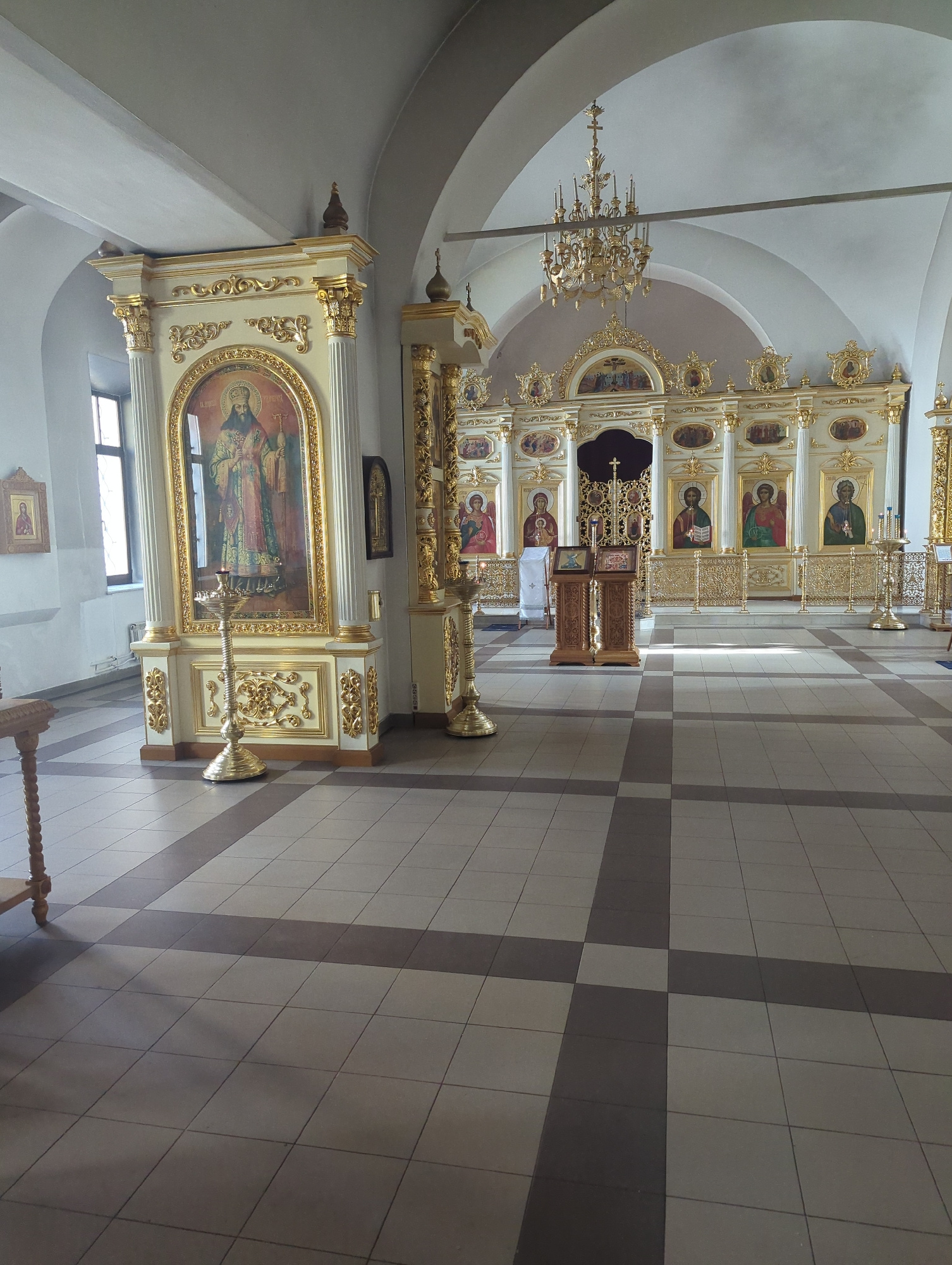 The image shows the interior of a church, possibly an Orthodox church based on the iconography and architecture. The prominent feature is a highly ornate and gilded iconostasis, a screen separating th…read more