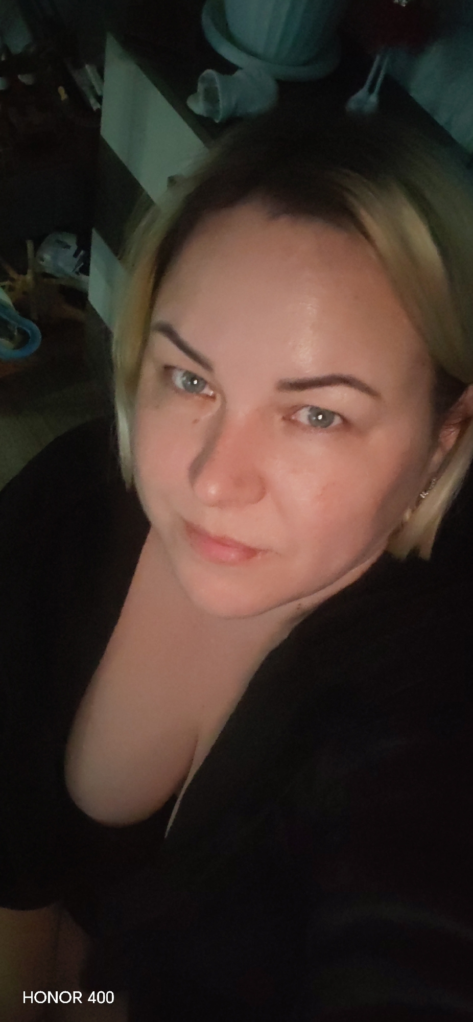 A woman with blonde hair and blue eyes poses for a selfie in what appears to be an indoor setting. She is wearing a black top. The background is dimly lit and cluttered with various objects, including…read more