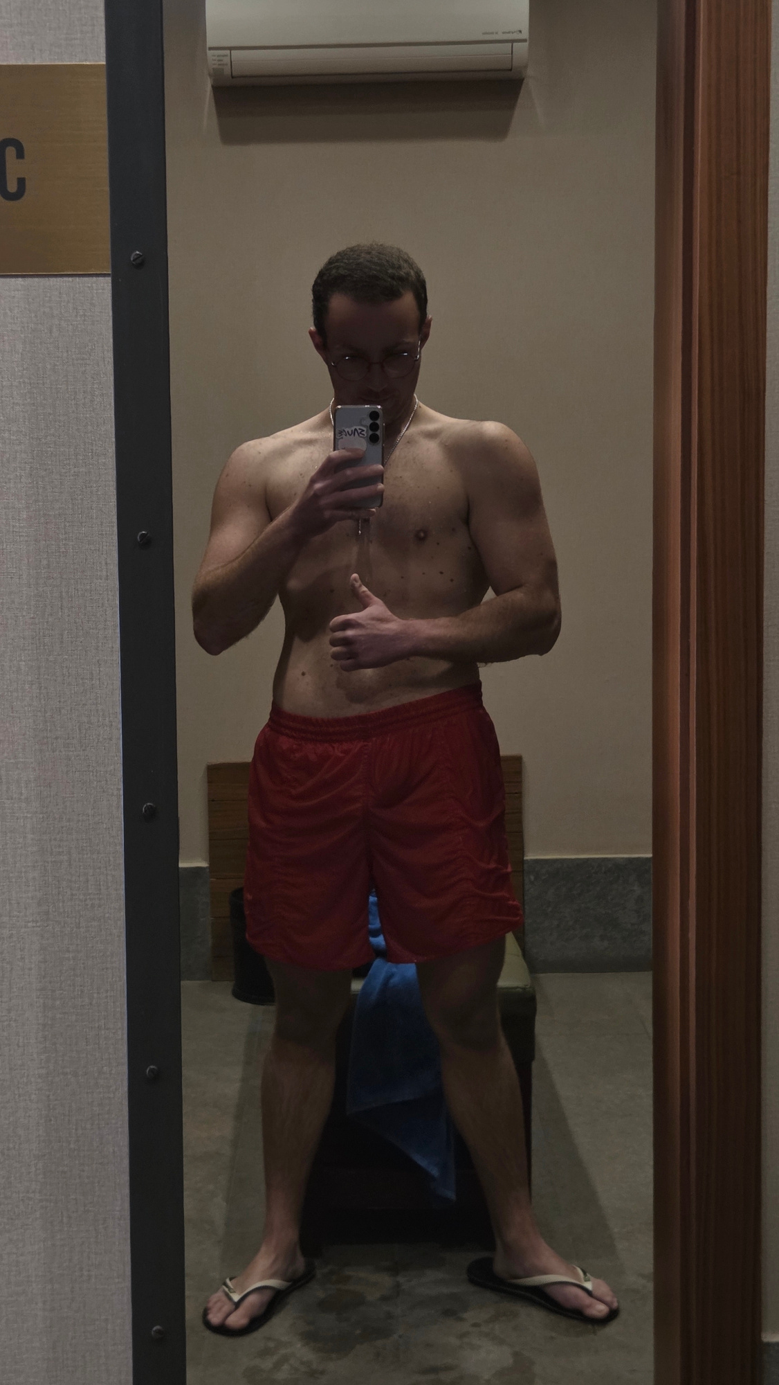 A Caucasian male with a medium build, short dark hair, wearing glasses and a silver chain, is standing in what appears to be a hotel bathroom, possibly in Bania, Bulgaria, as the prompt suggests. He i…read more