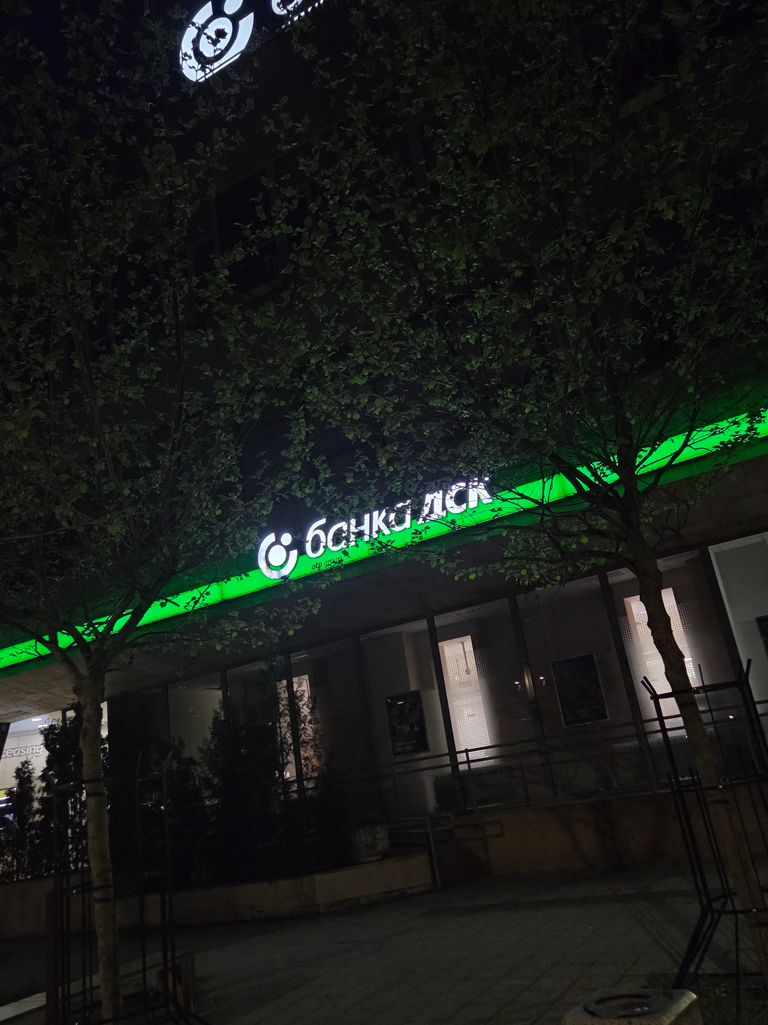 An outdoor, slightly tilted, nighttime photograph captures the facade of a building adorned with a prominent green illuminated sign and lush foliage. The scene is dark, suggesting late evening or nigh…read more