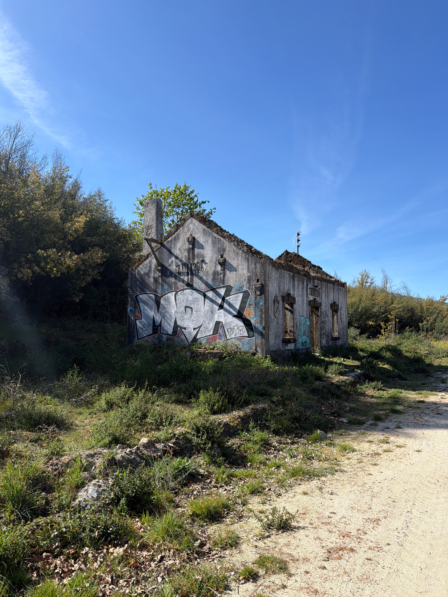The image shows the ruins of a building in Vila Real, Portugal. The building's exterior walls are predominantly grey and covered in graffiti. The structure appears to be heavily damaged, with missing…read more