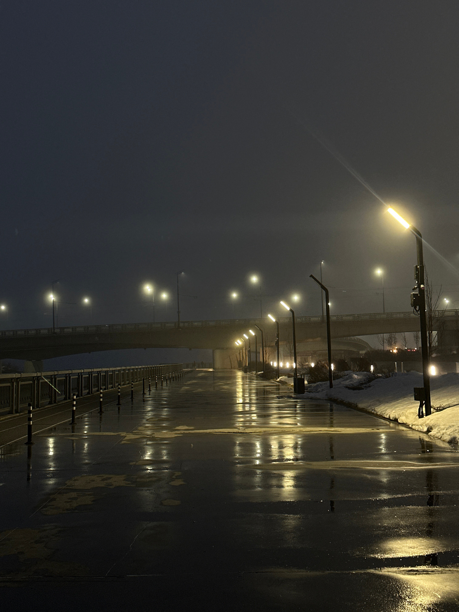 The image depicts a wet, dark street illuminated by a row of streetlights in Kazan, Russia. The street reflects the light from the lamps, creating streaks of light on the asphalt. A barrier runs along…read more