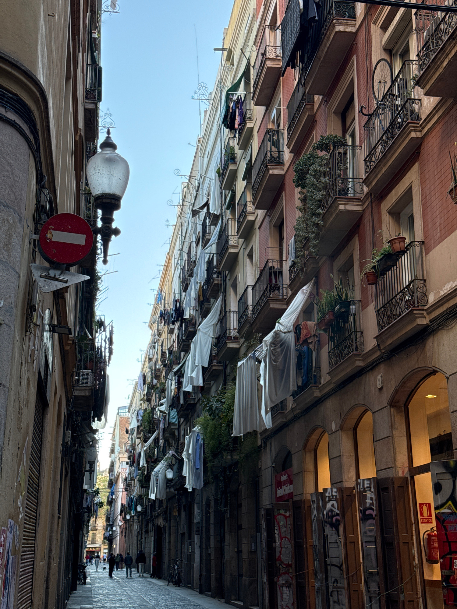 The image shows a narrow street scene in Barcelona, Spain, viewed from a low angle. Balconies with plants, hanging clothes, and awnings extend from the buildings on both sides, creating a sense of encβ¦read more