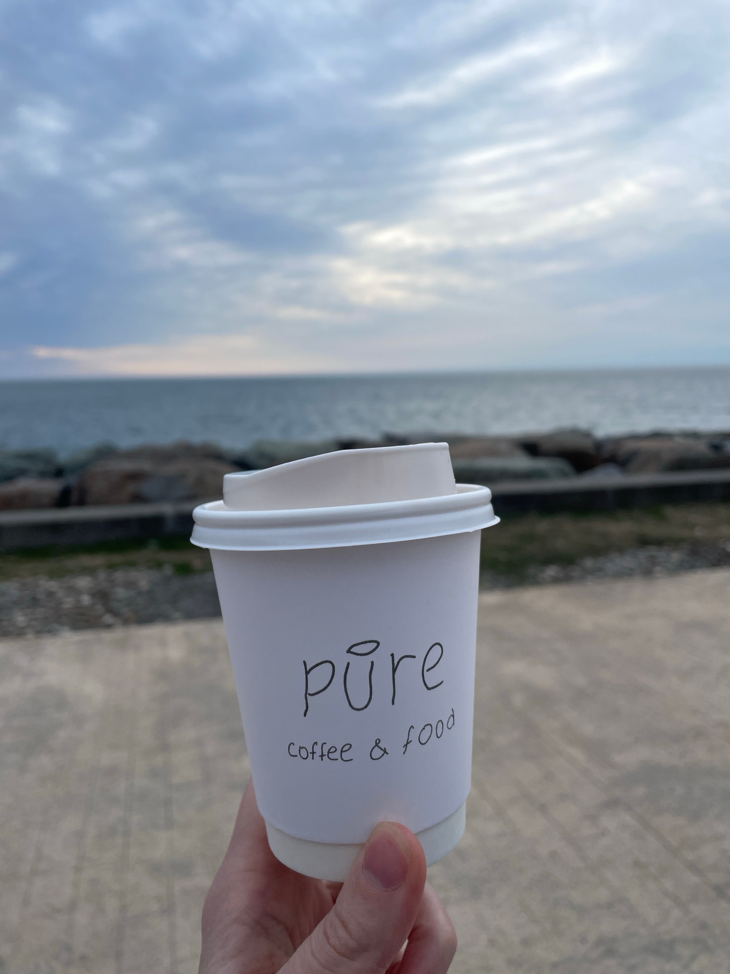 A hand holds a white paper cup with "pure" and "coffee & food" written on it. The background shows a cloudy sky, a body of water, and a rocky shoreline. The image was likely taken in Batumi, Georgia,…read more