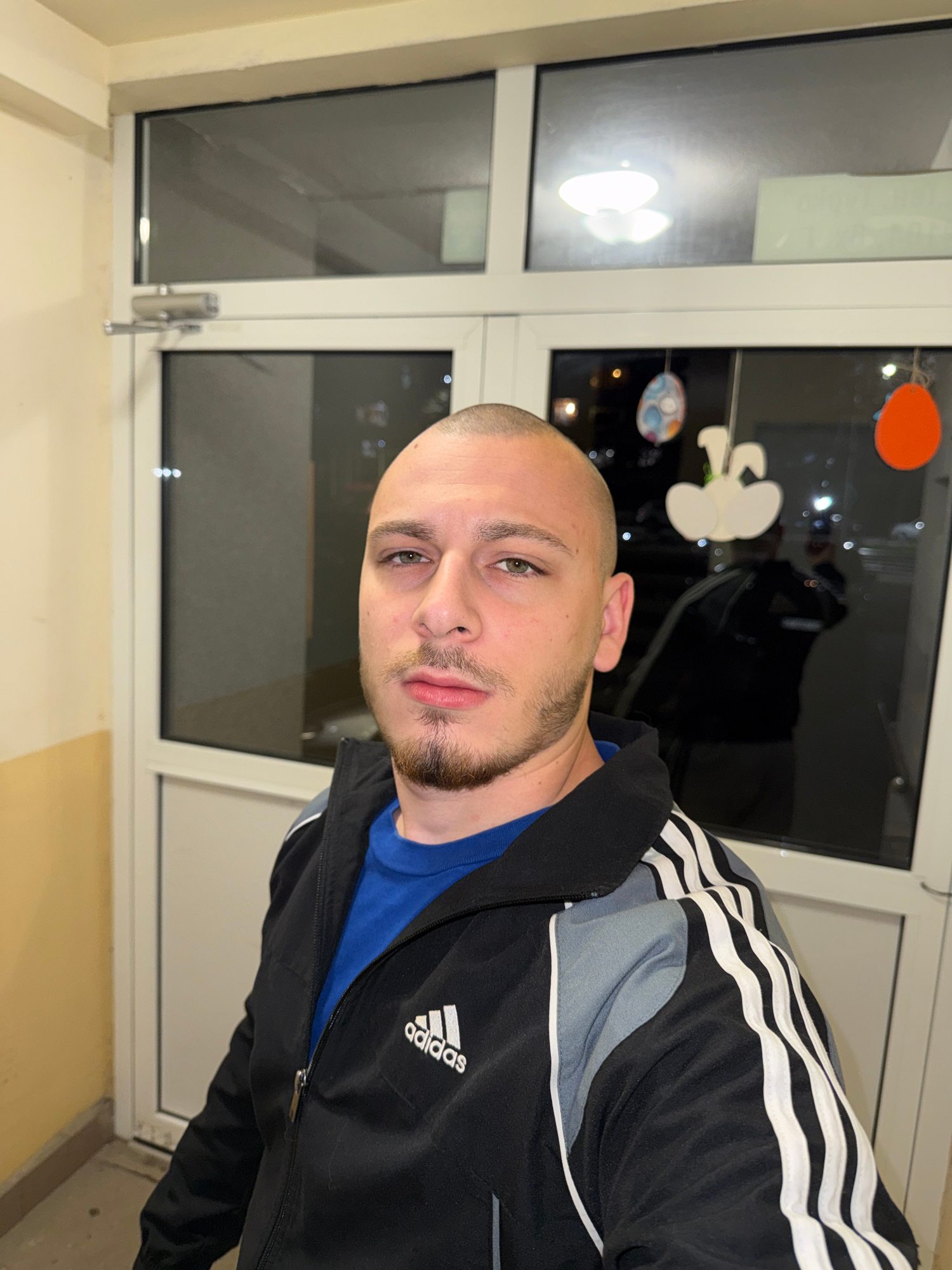 A medium-height, light-skinned man with a shaved head, stubble, and a blue shirt is wearing a black Adidas jacket with three white stripes along the shoulders and sleeves. He is looking directly at th…read more