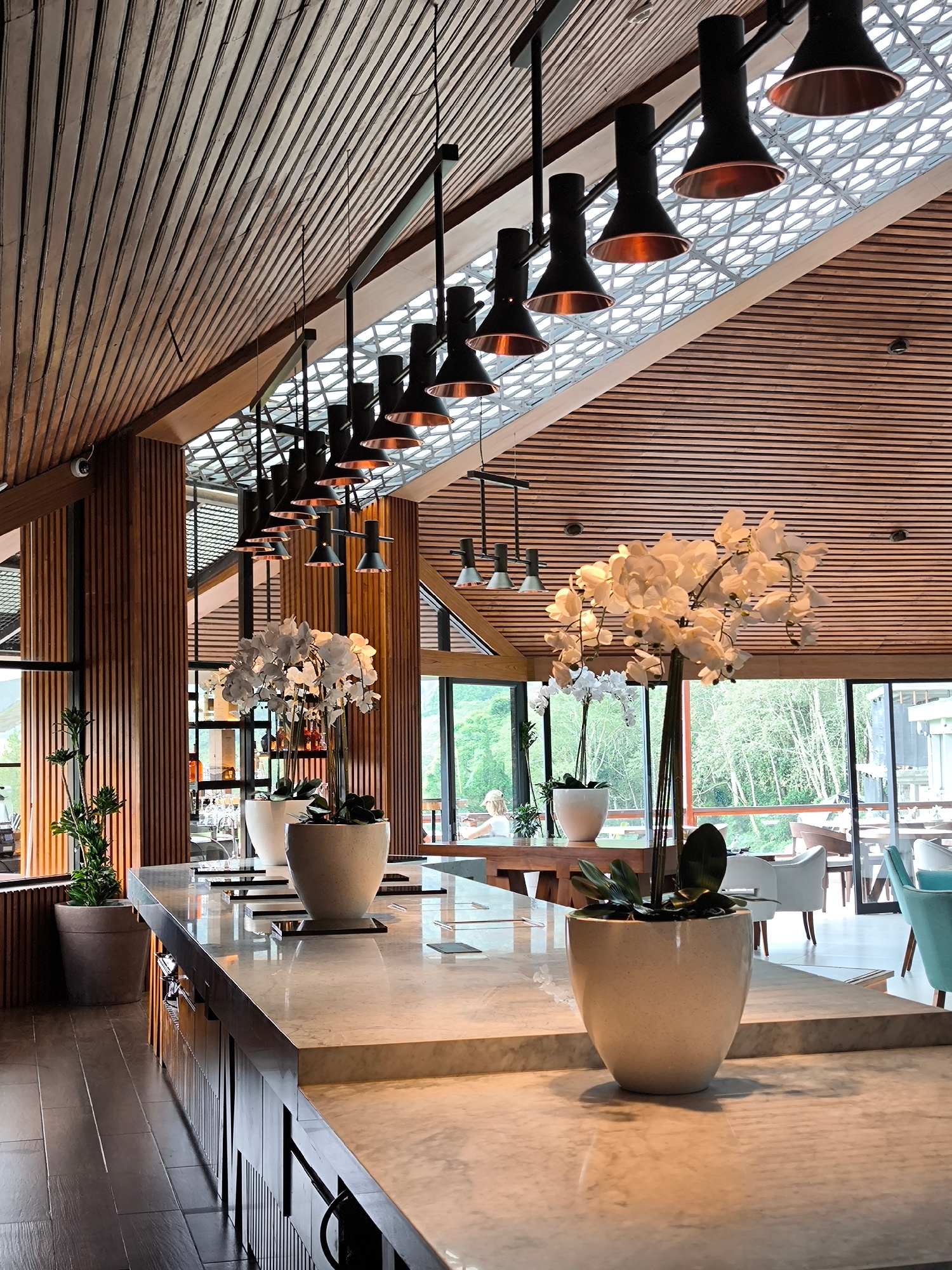 The image captures the interior of a high-end venue, potentially a restaurant or hotel lounge, located in Wanagiri, Indonesia, as suggested by the architectural design elements and natural scenery vis…read more