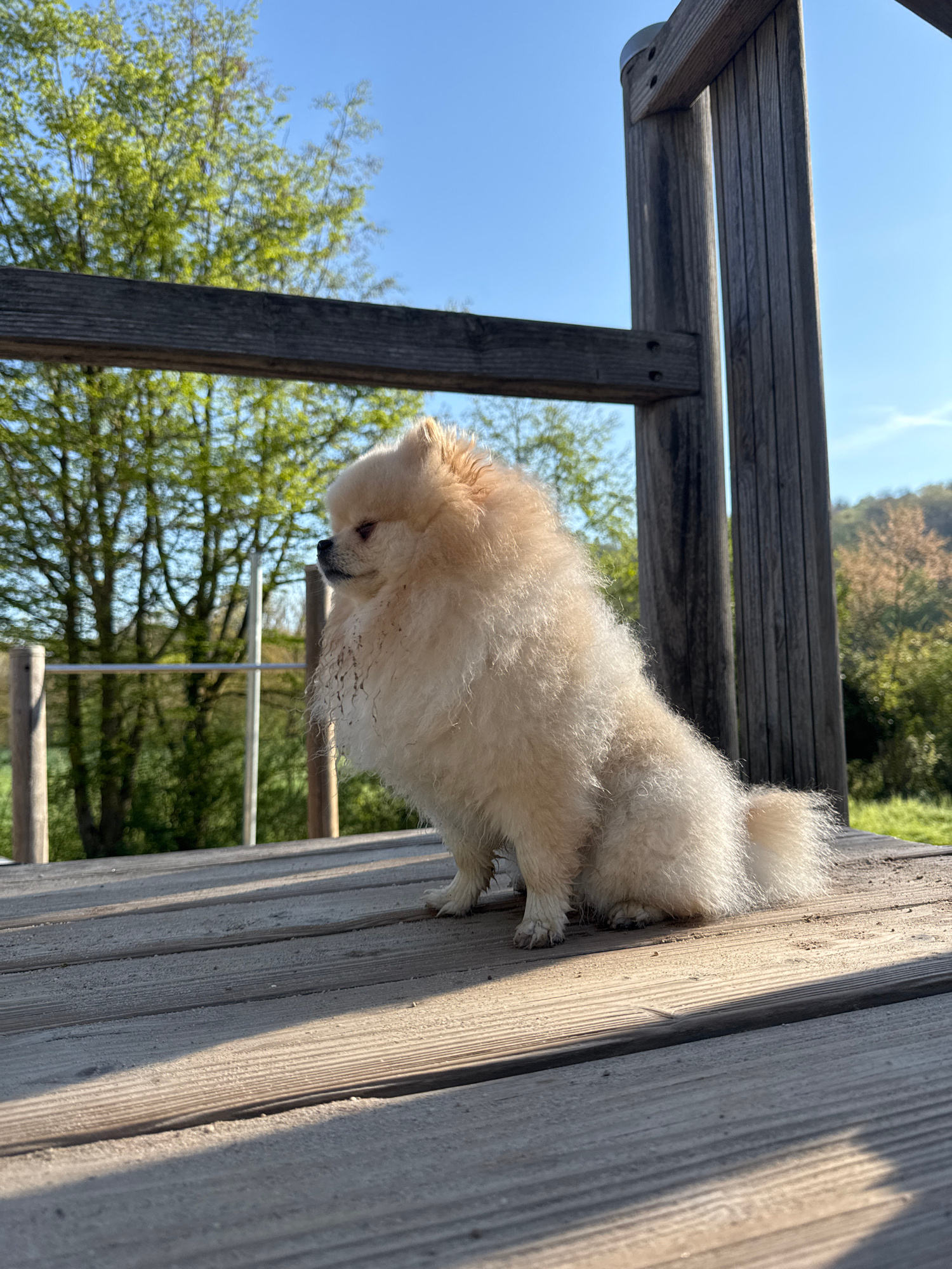 A small, fluffy, light-colored dog, likely a Pomeranian, is the main subject, positioned on a weathered wooden platform. The dog, with cream-colored fur, is looking downwards, with its head slightly lā¦read more