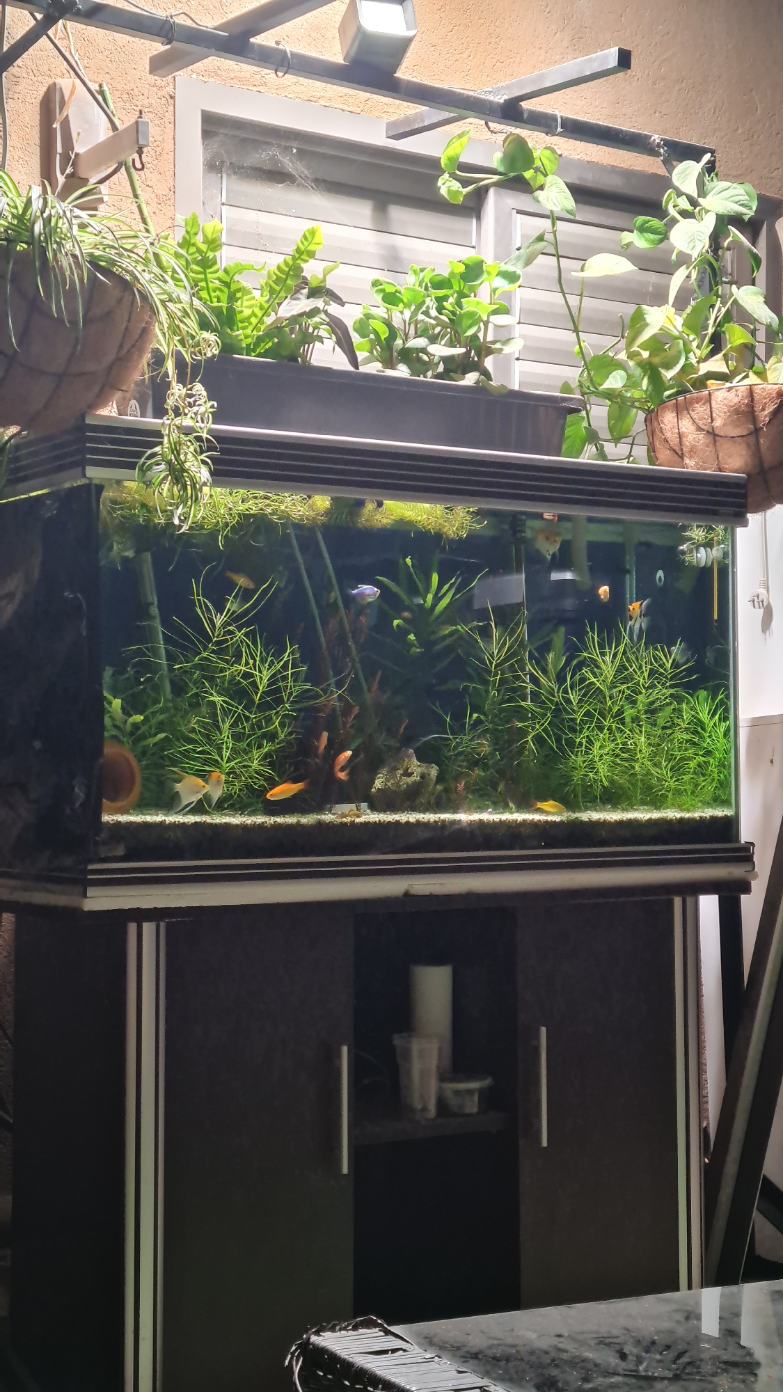 A rectangular fish tank filled with water, various aquatic plants, and fish is positioned between a window covered with green plants and a dark, two-door cabinet. The fish tank is illuminated by a lig…read more