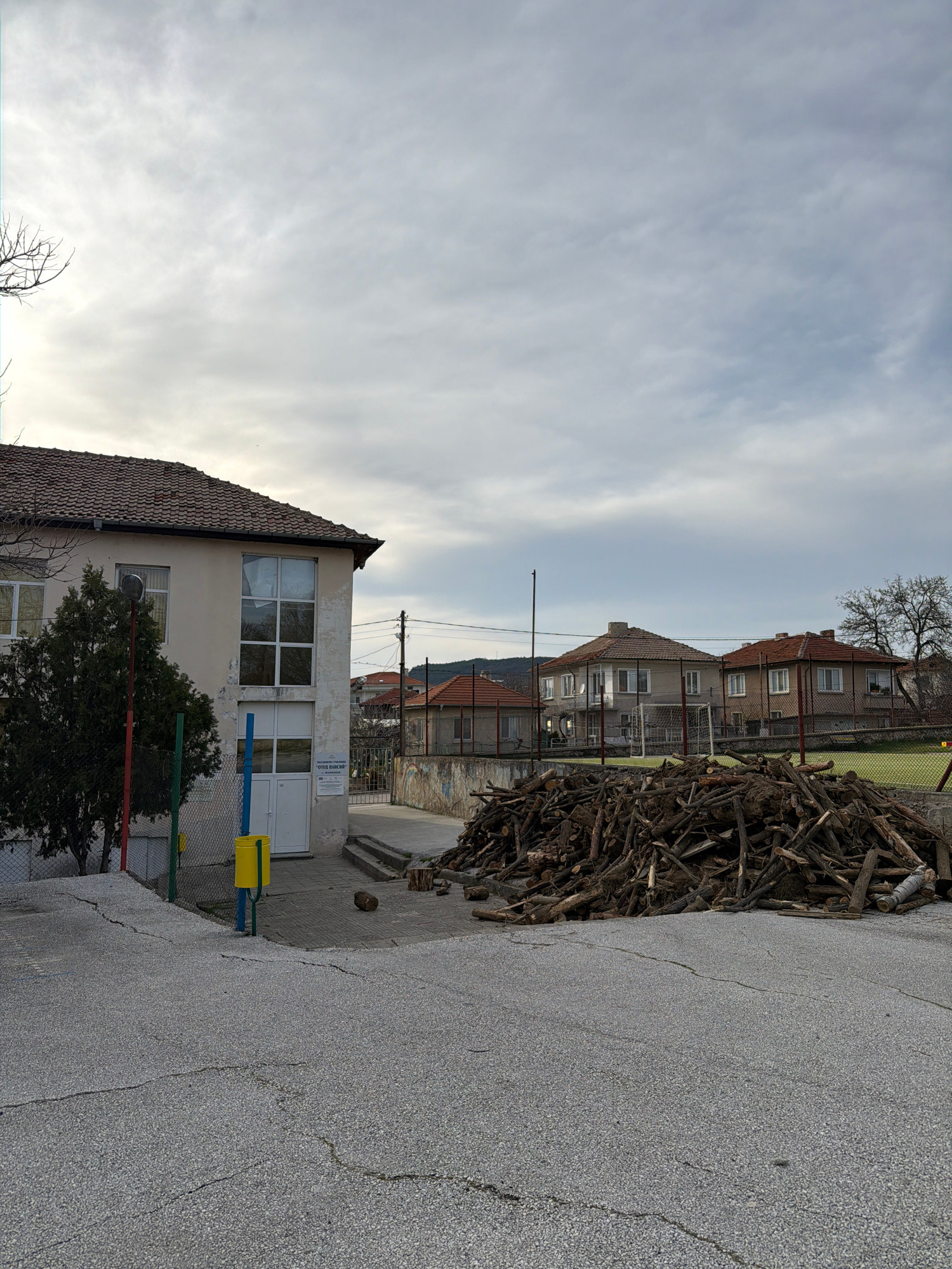 The image presents a view in Popintsi, Bulgaria. A pile of firewood sits beside a cracked asphalt surface, next to a light-colored building with a tiled roof. Windows are visible on the building. The…read more