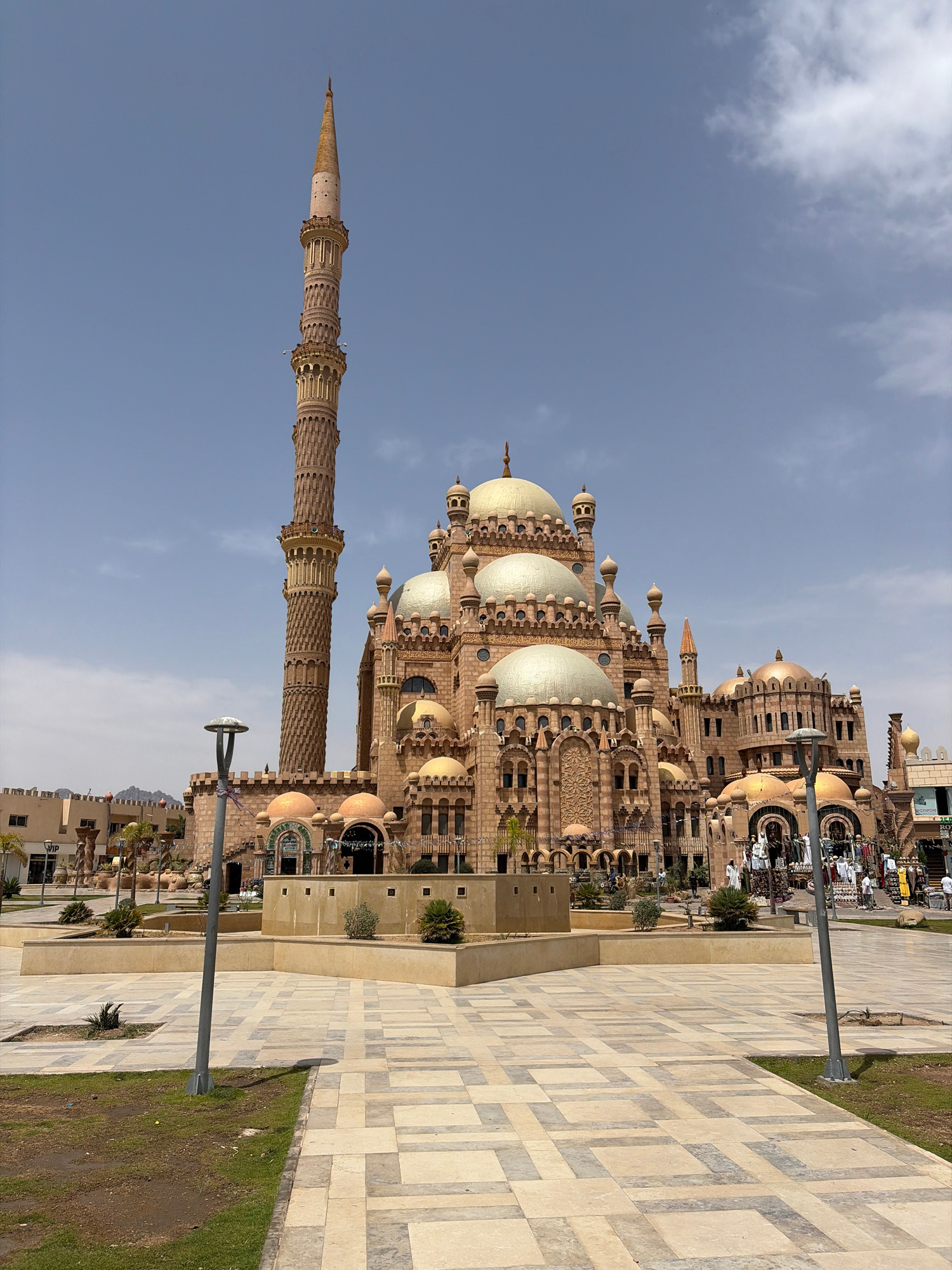 The image depicts Al-Mustafa Mosque, located in Sharm El Sheikh, Egypt. The mosque, built of stone with ornate carvings, features a tall minaret and multiple domes, some of which are white. The courty…read more