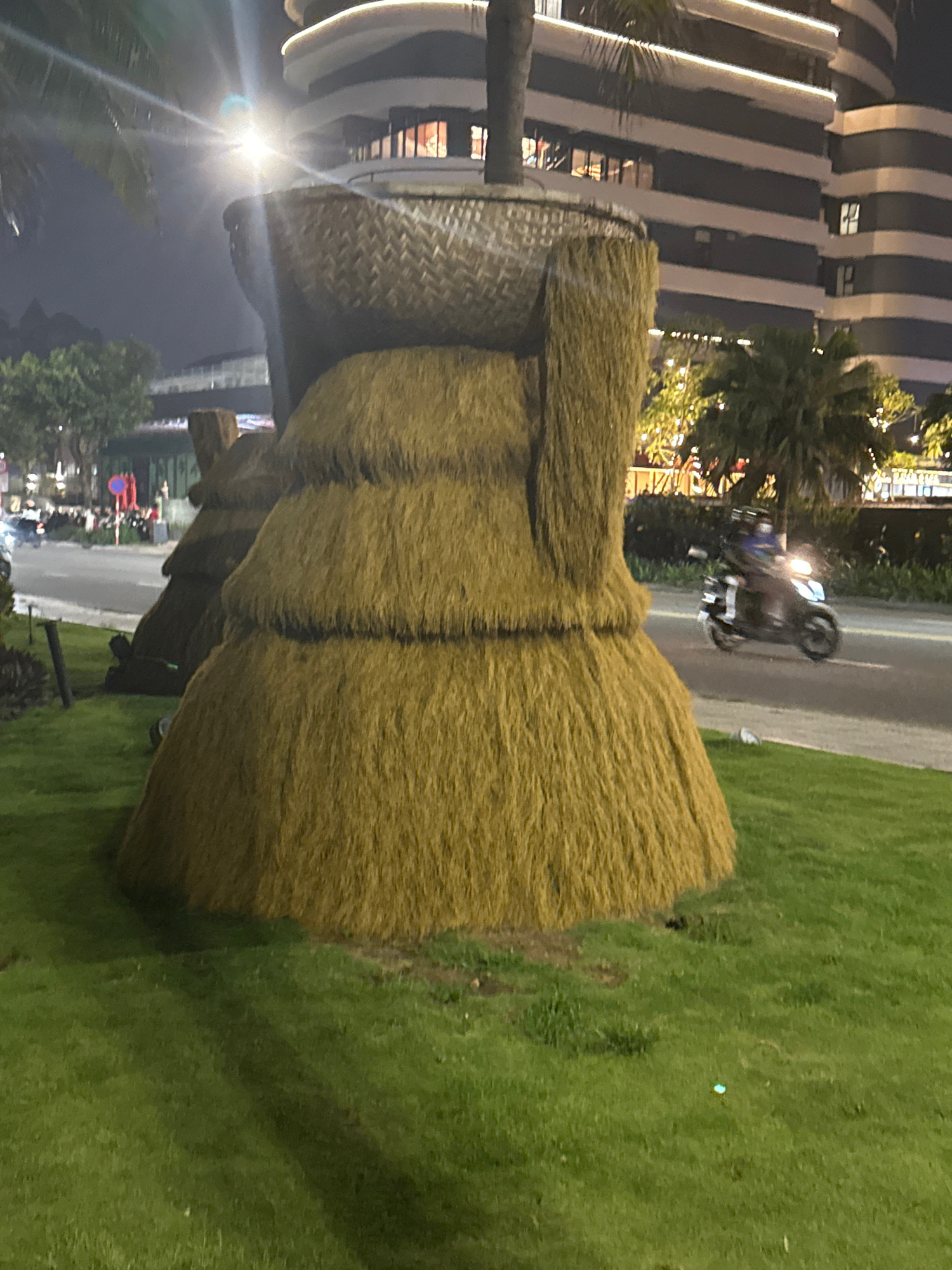 The image depicts a large Moai statue made of straw or hay, situated on a grassy area next to a road in Đà Nẵng, Vietnam. Behind the statue, there is a building with a unique architecture of curved wh…read more