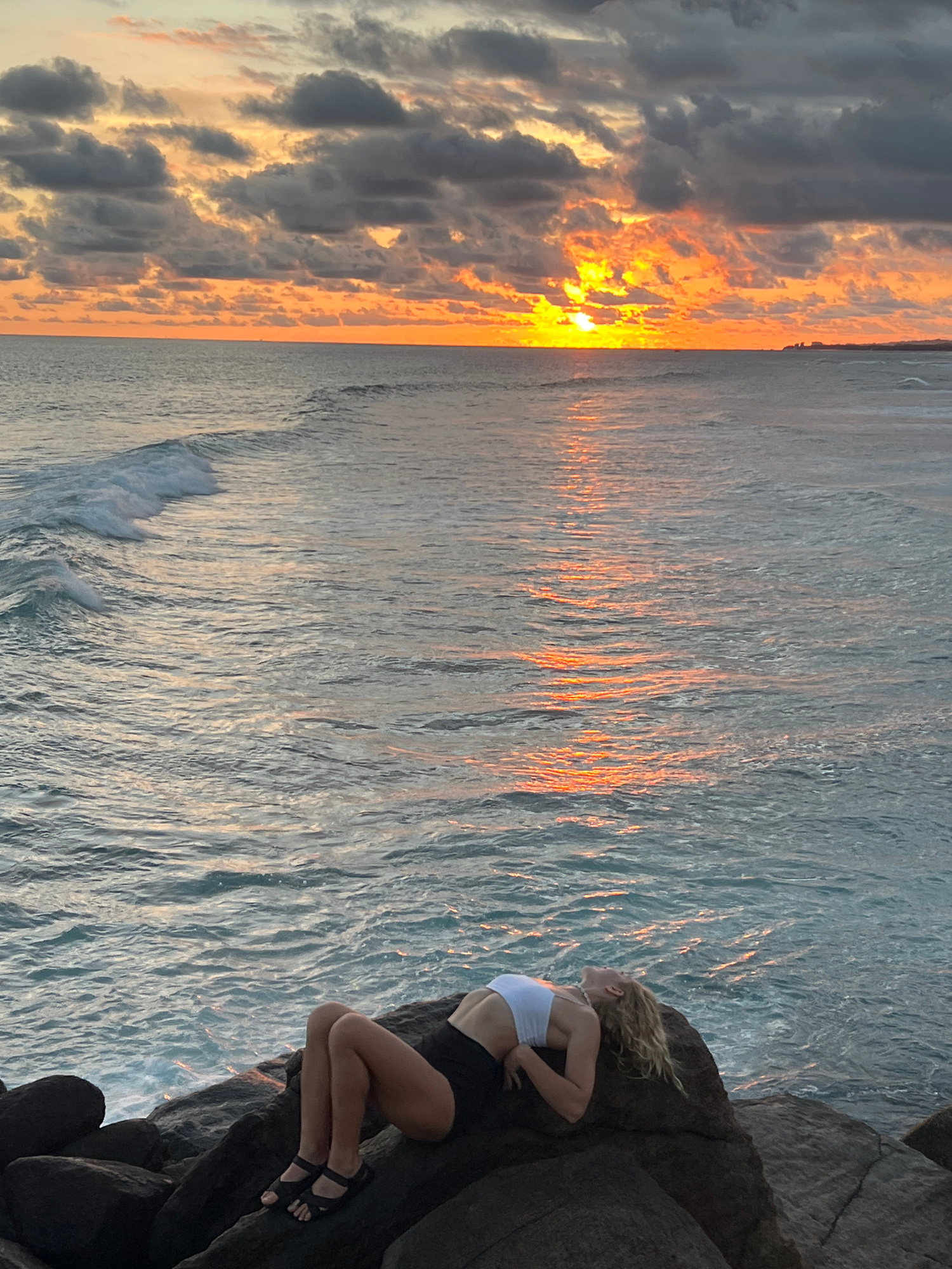 A woman is sitting on dark rocks overlooking the ocean at sunset. She is wearing a white top, dark shorts, and black sandals. The sunset is visible in the sky, with the sun's reflection shimmering on…read more