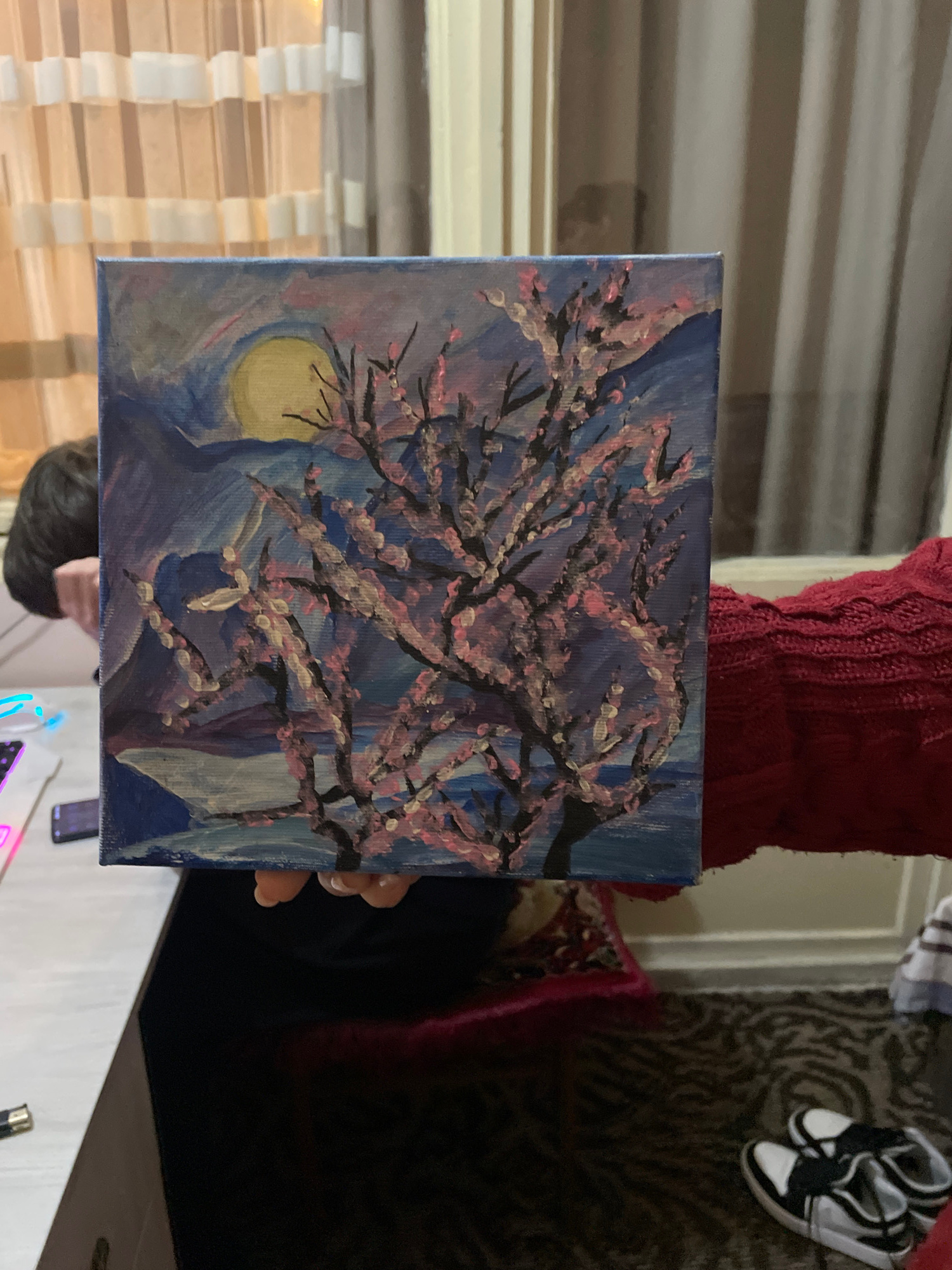 A painting depicting a flowering tree branch silhouetted against a blue background with a yellow moon, is being held. The painting is square and appears to be acrylic on canvas. The background include…read more