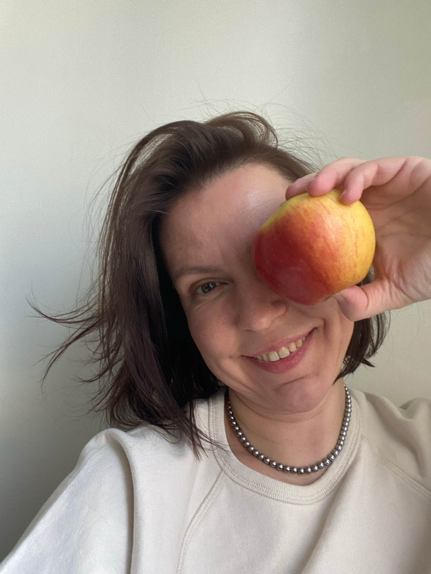 A woman is holding a red and yellow apple near her forehead. She is smiling, and wearing a light-colored sweatshirt and a silver beaded necklace. The background is a plain white wall. The image is rotβ¦read more