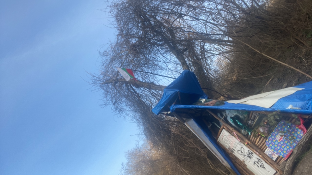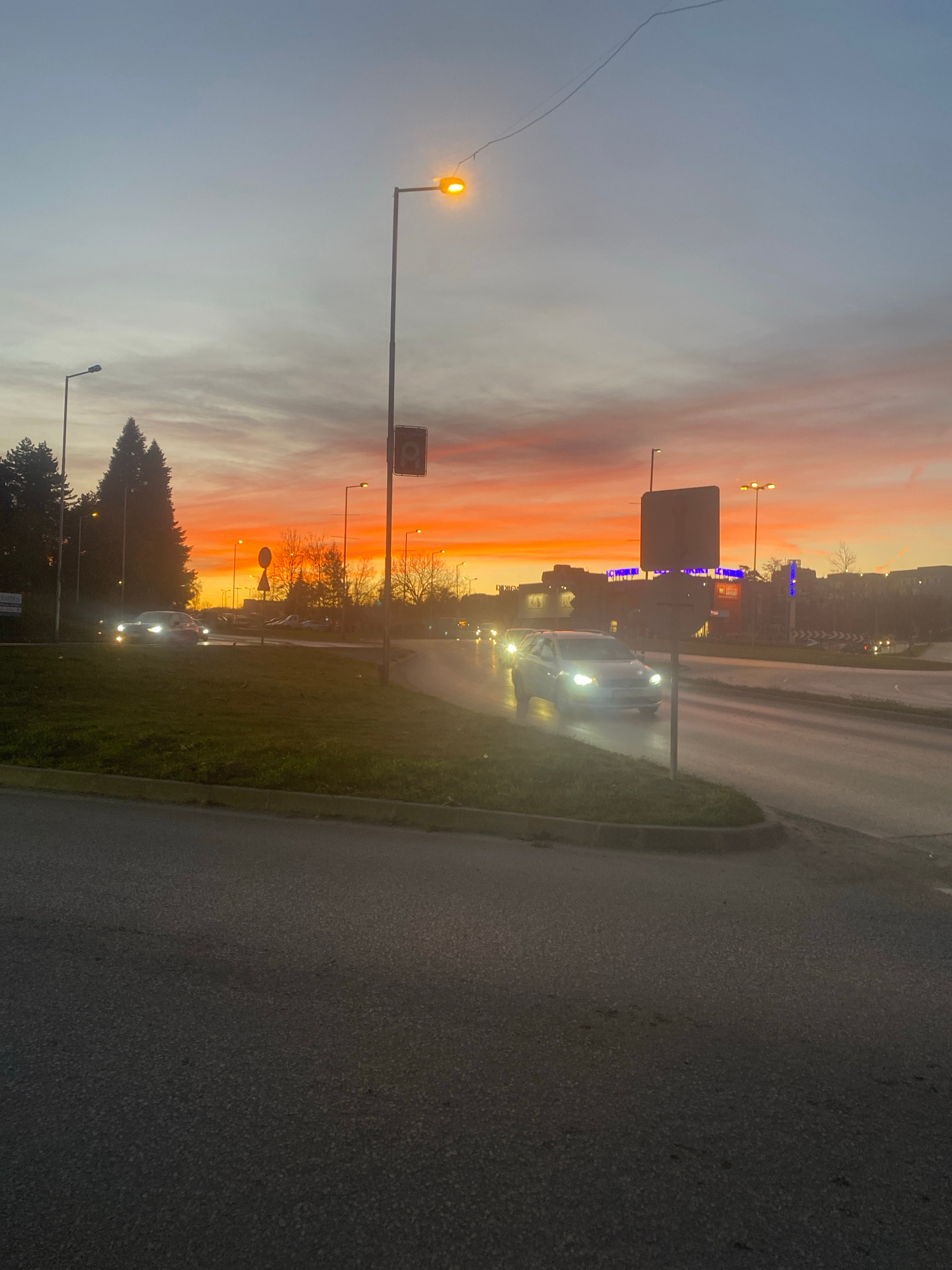 The image captures a street scene at sunset in what appears to be the city of Veliko Tarnovo, Bulgaria. The sky displays a vibrant gradient of orange and grey hues. Along the road are streetlights, sā¦read more