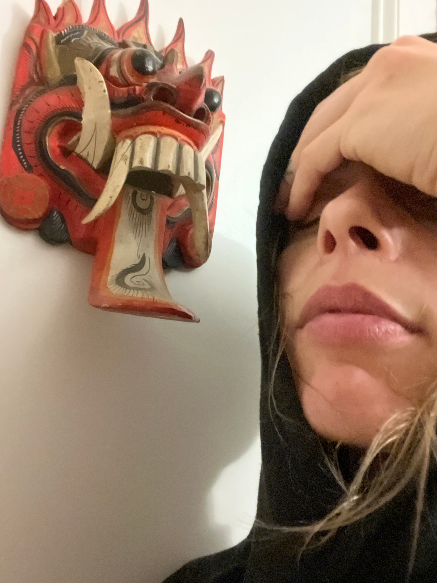 The image displays a rotated view of a person and an ornate mask against a plain, light-colored background. In the upper portion of the frame, a person's face is visible, oriented upside down. Feature…read more