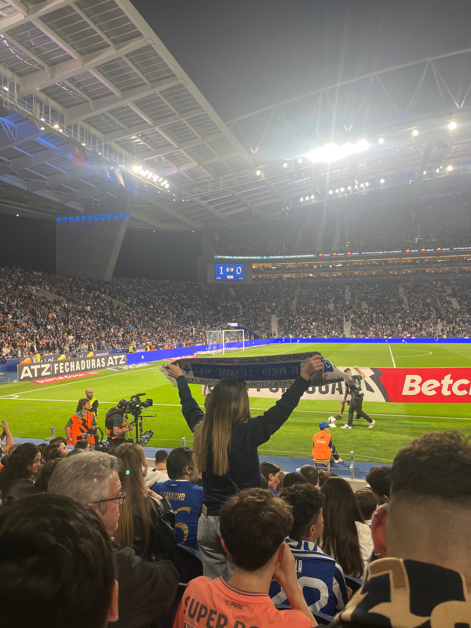 The image shows a view from the stands at a football match, most likely at the Estádio do Dragão in Porto, Portugal. The stadium is densely packed with spectators. The game appears to be in the 45th m…read more