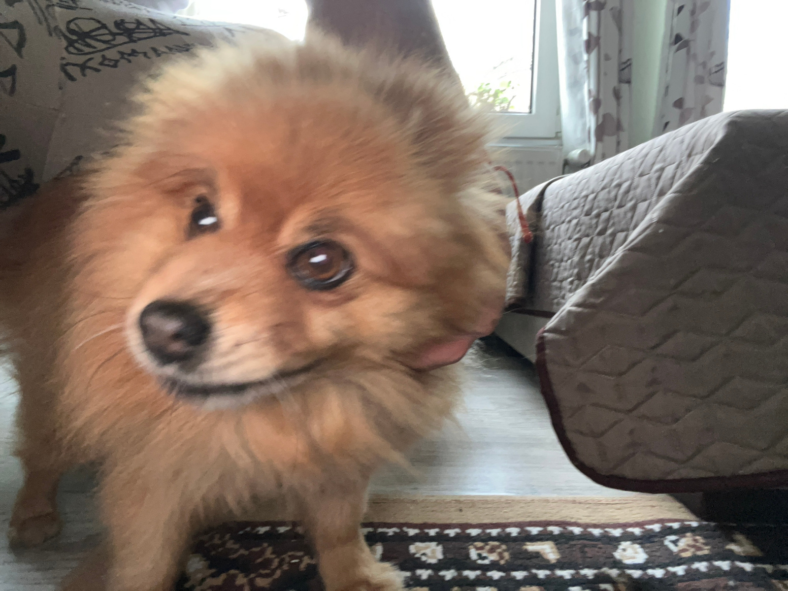 The image is an upside-down close-up of a tan-colored dog, possibly a Pomeranian or similar breed, looking directly at the camera. The dog has brown eyes and a black nose. The background includes a brown patterned rug, a quilted cushion or cover, and a window with sheer curtains. Outside the window, green foliage is visible, suggesting an outdoor setting. Based on the request, the location is in the city of Asenovgrad, Bulgaria. | Open Wire