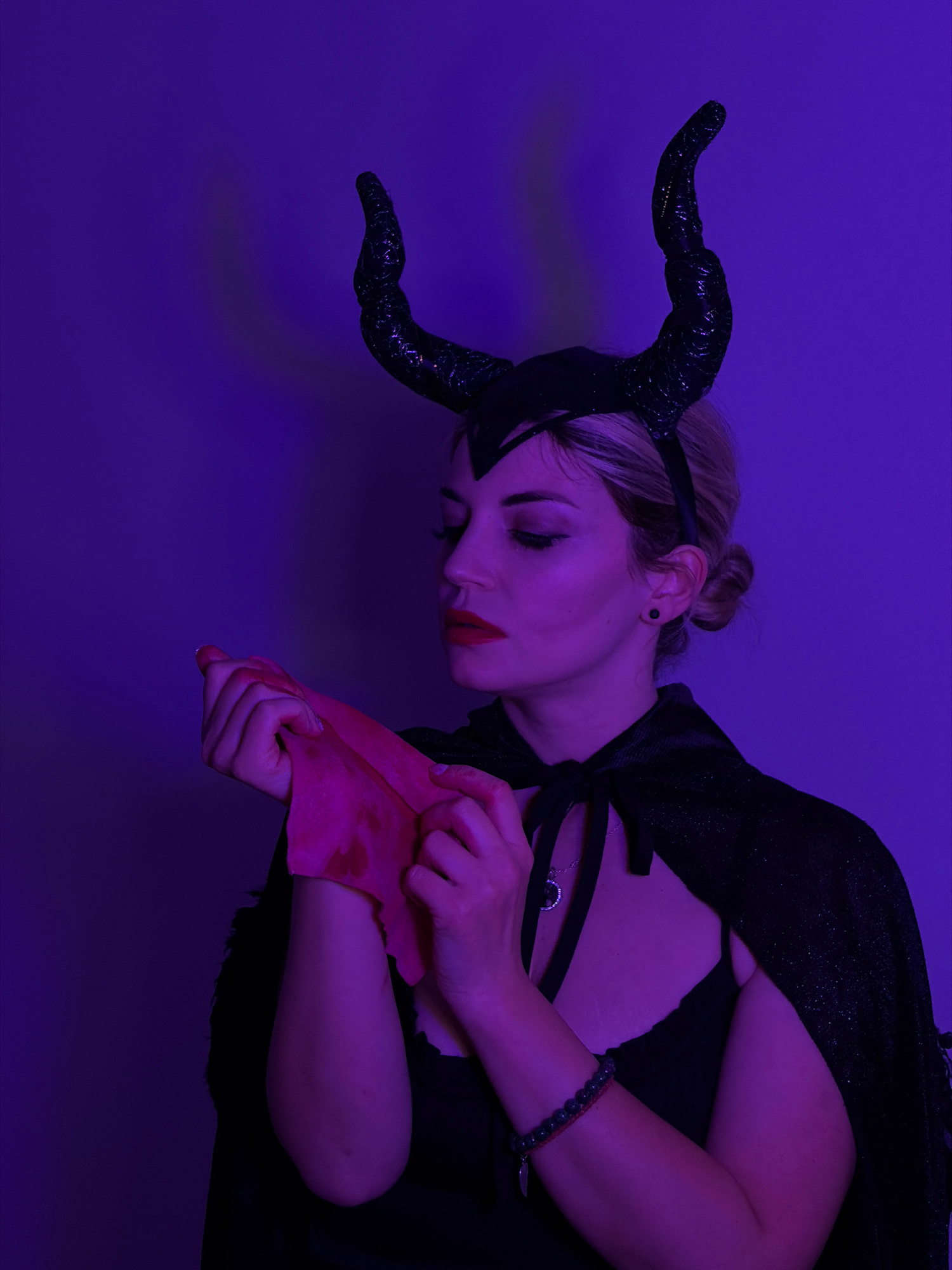 A woman dressed as Maleficent is examining a blood-soaked cloth. She is wearing black horns, a cape, and dark clothing. Her expression is one of contemplation or concern. The scene is lit with a stron…read more