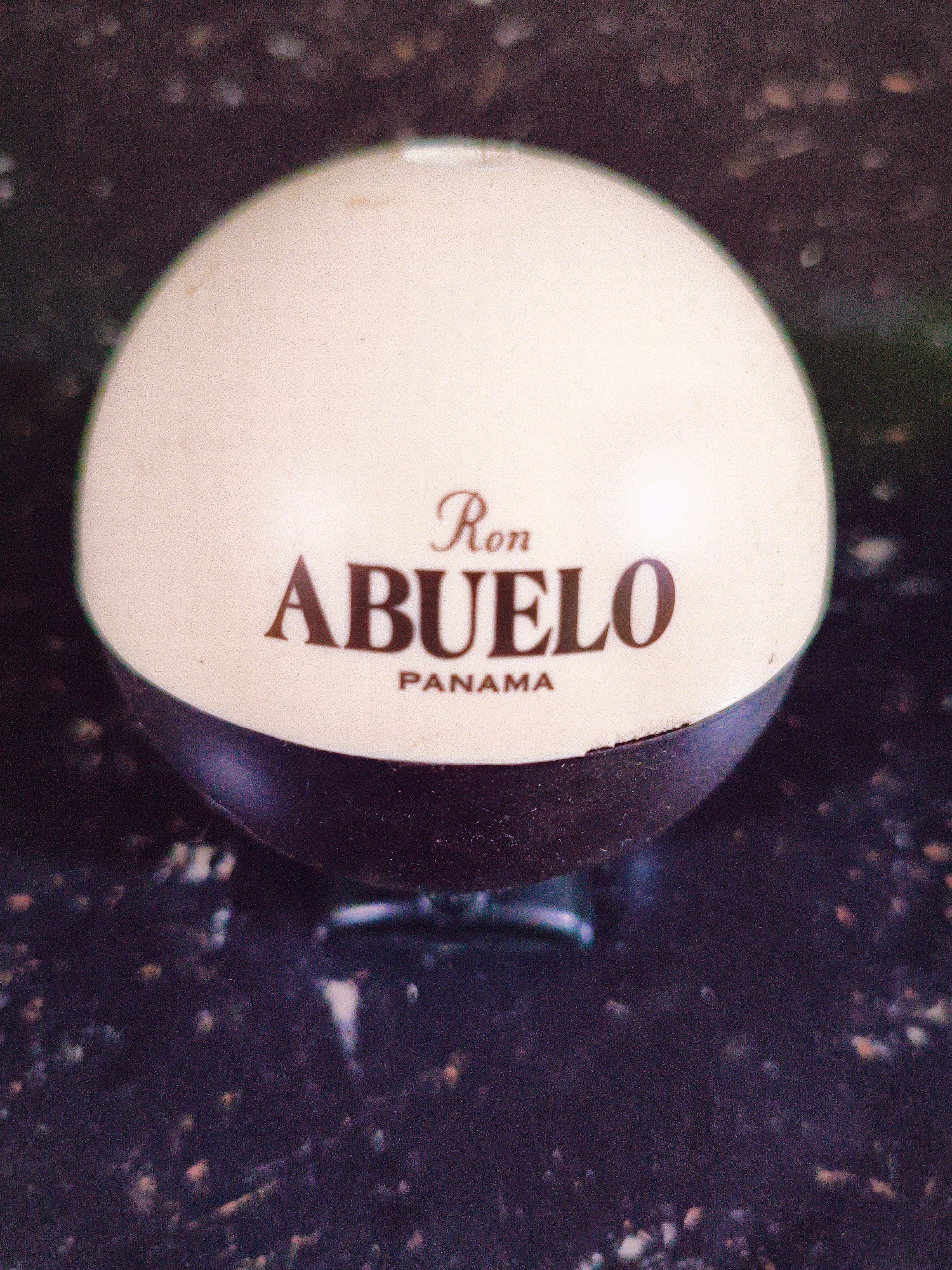 A close-up photograph depicts a spherical object, possibly a promotional item, featuring the text "Ron ABUELO PANAMA" in brown lettering. The upper half of the sphere is a creamy white color, while th…read more