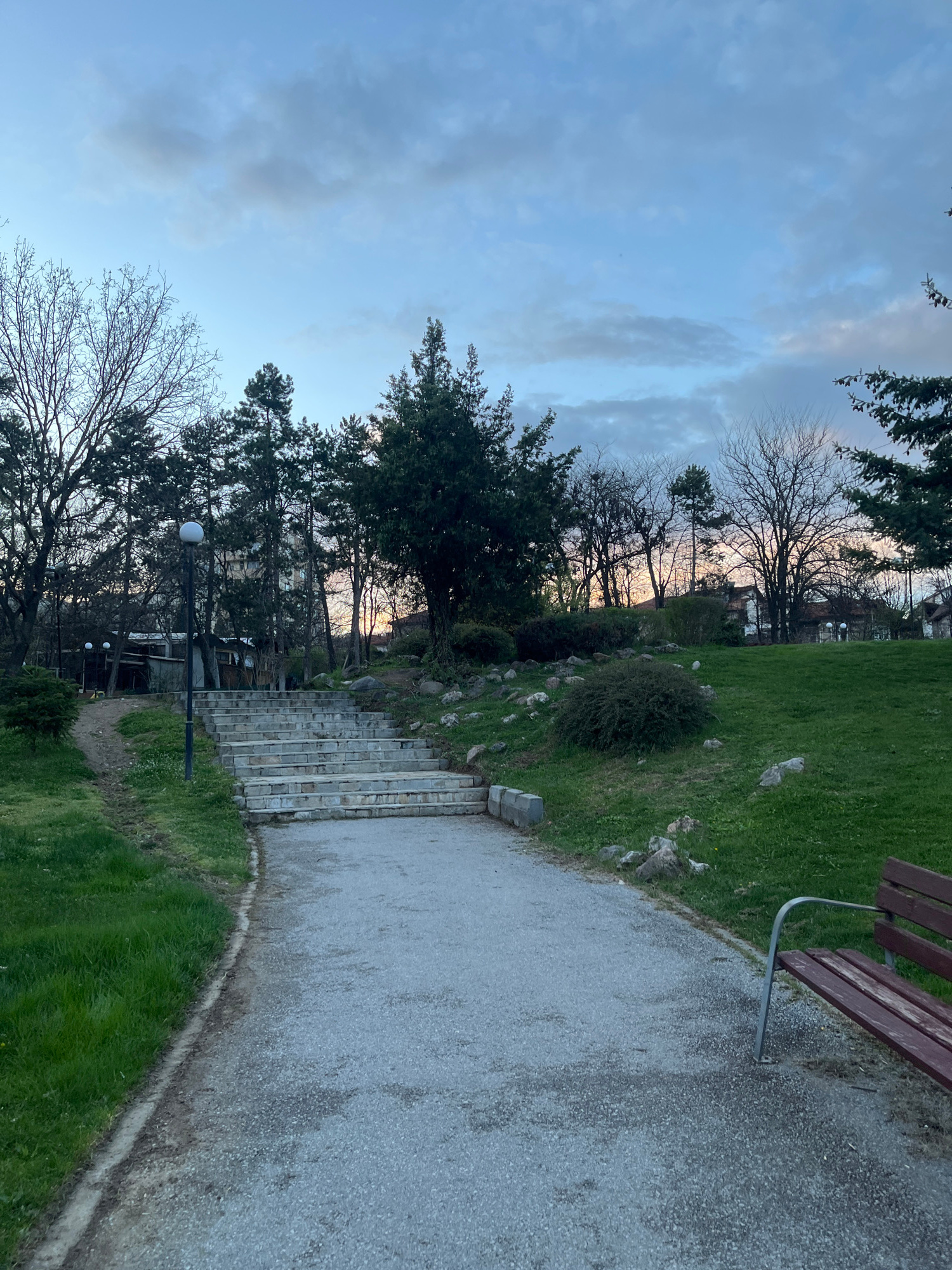 The image depicts a park setting. A gravel path runs along the right side of the frame, leading upwards. Adjacent to the path is a grassy area with trees and shrubs. A park bench is partially visible…read more