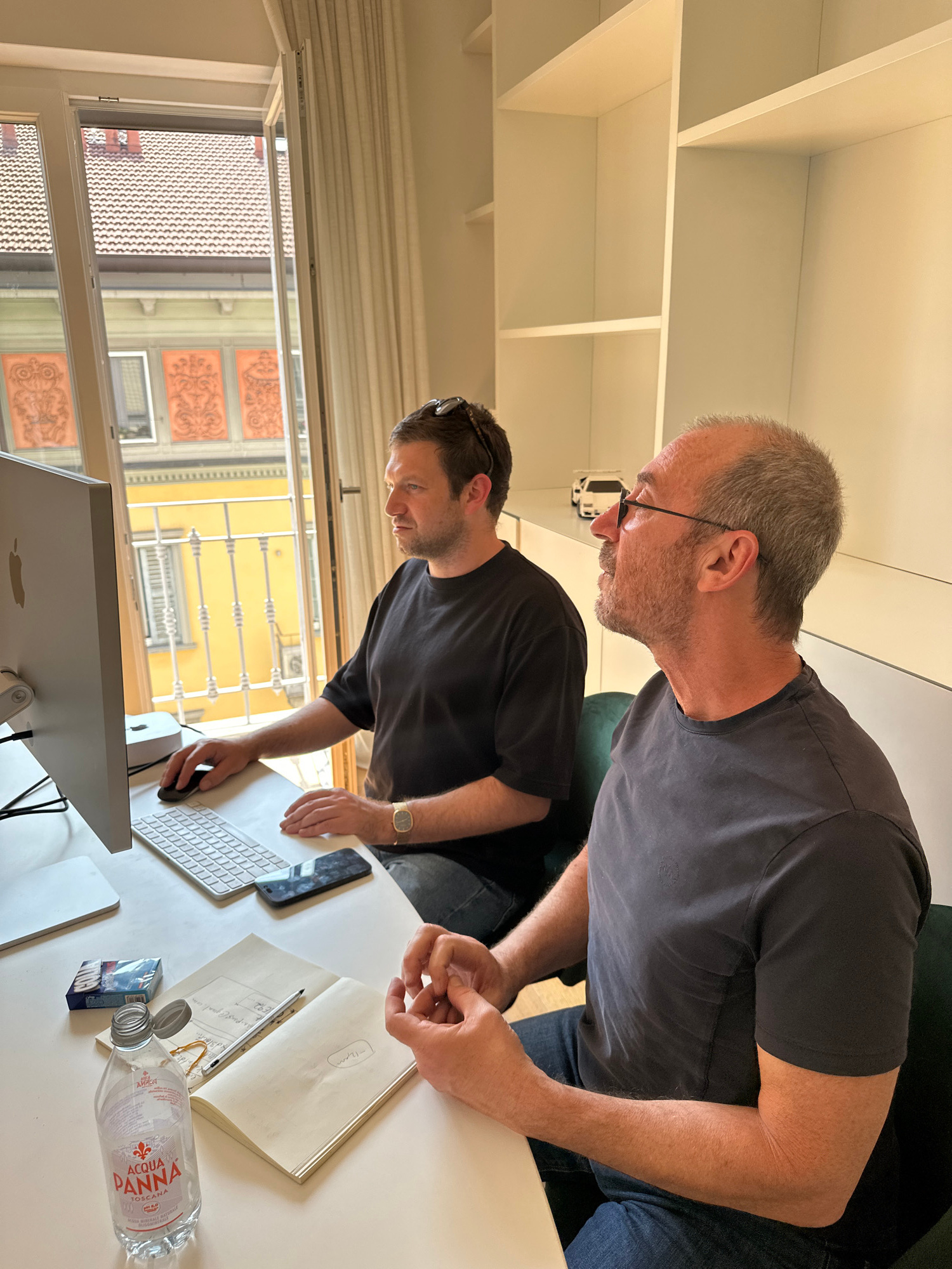 Two men are engrossed in work at a white desk in what appears to be an office or study in Milan, Italy. The older man, wearing glasses and a dark t-shirt, leans forward intently, observing something o…read more