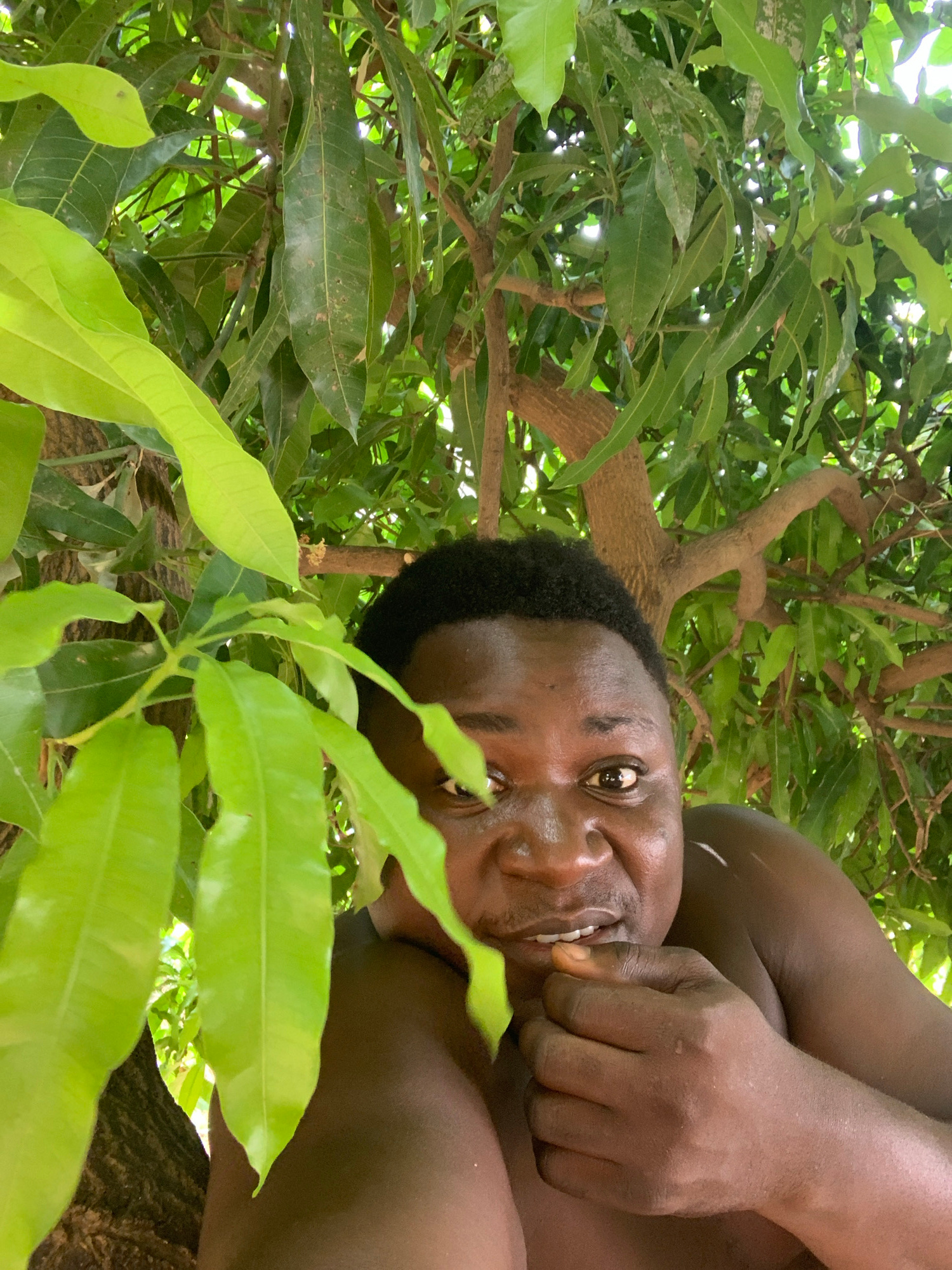 A close-up, low-angle shot depicts a dark-skinned individual among the branches and leaves of a tree. The person is looking directly at the camera and smiling. Their right hand is raised near their mo…read more