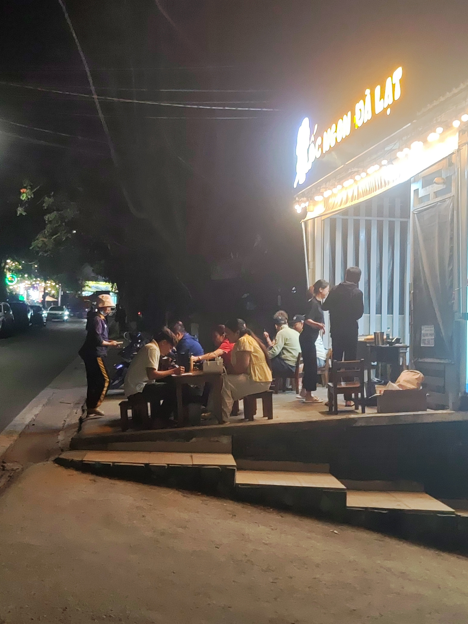 The image shows an outdoor dining area in Da Lat, Vietnam at night. Several people are seated at tables, and a server wearing a face mask and hat is taking orders or delivering food. The restaurant ha…read more