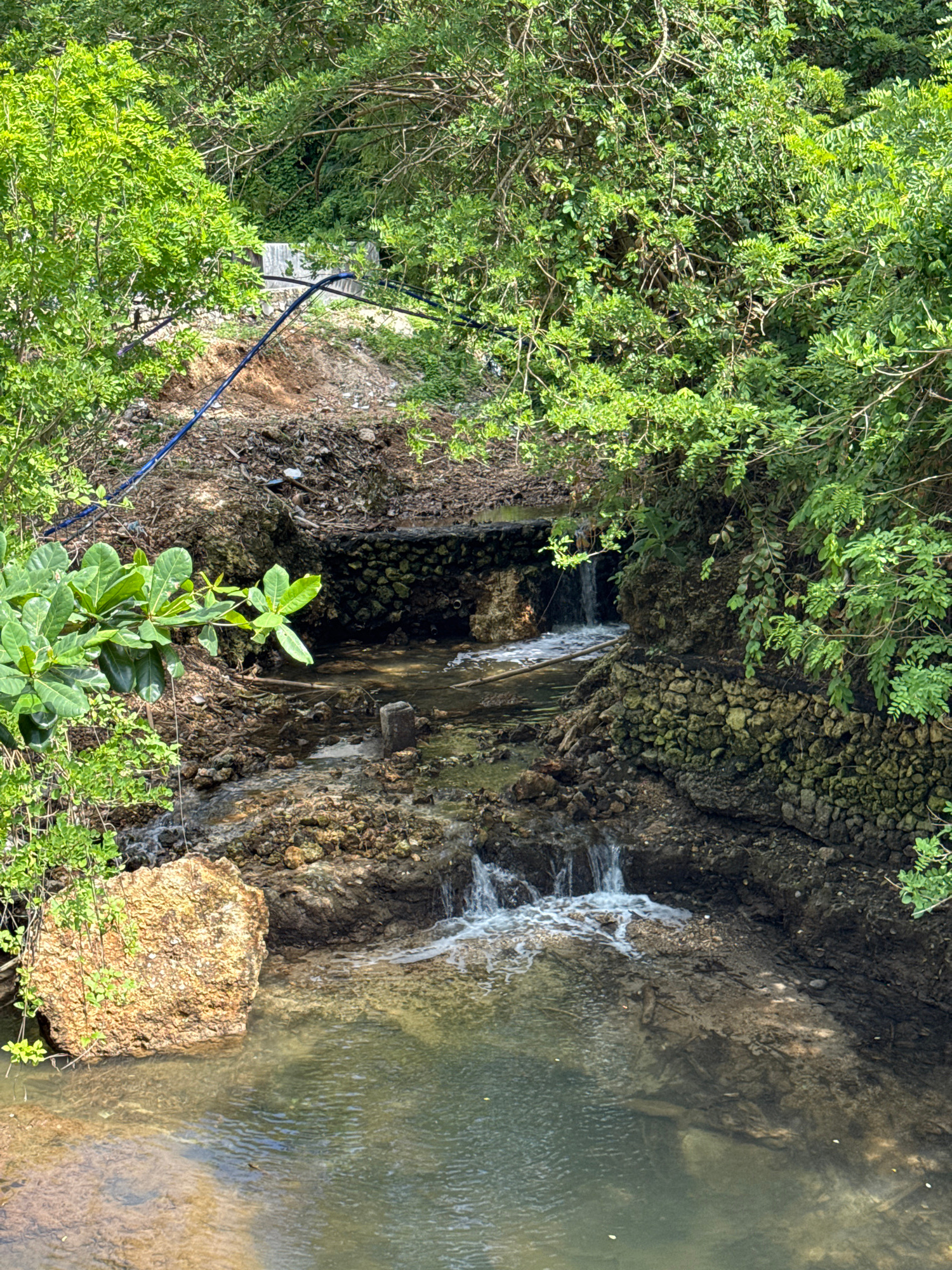 The image shows a small waterfall in Kuta Selatan, Indonesia. The water flows over rocks and concrete structures into a pool. Lush green vegetation surrounds the waterfall, growing on the rocky banks.…read more