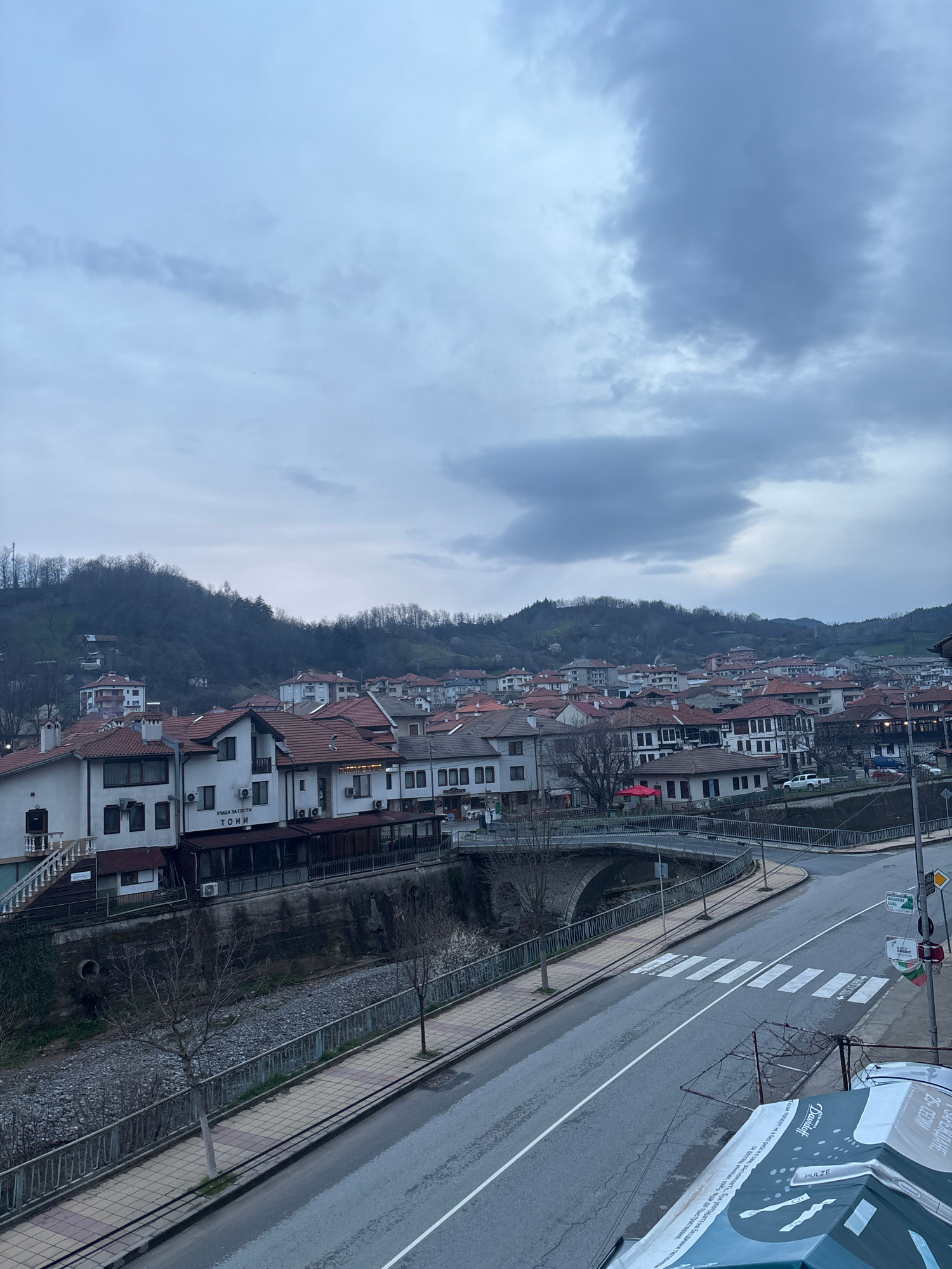 The image depicts a street scene in Zlatograd, Bulgaria. The view is angled downward from a high vantage point, showing a winding road with a pedestrian crosswalk. Along the right side of the road, there is a billboard advertising Davidoff Pulze. Opposite the road, houses are built along a hillside, their red roofs and white walls contrasting against the grey sky and the dark green of the hill. In the foreground, there is a railing along a walkway that runs parallel to the road, with bare tree branches visible. The sky is overcast with heavy clouds. The houses appear to be of traditional Balkan architectural style. Some signs in Cyrillic are visible on the buildings, one of which reads "ТОНИ" (TONI). | Open Wire