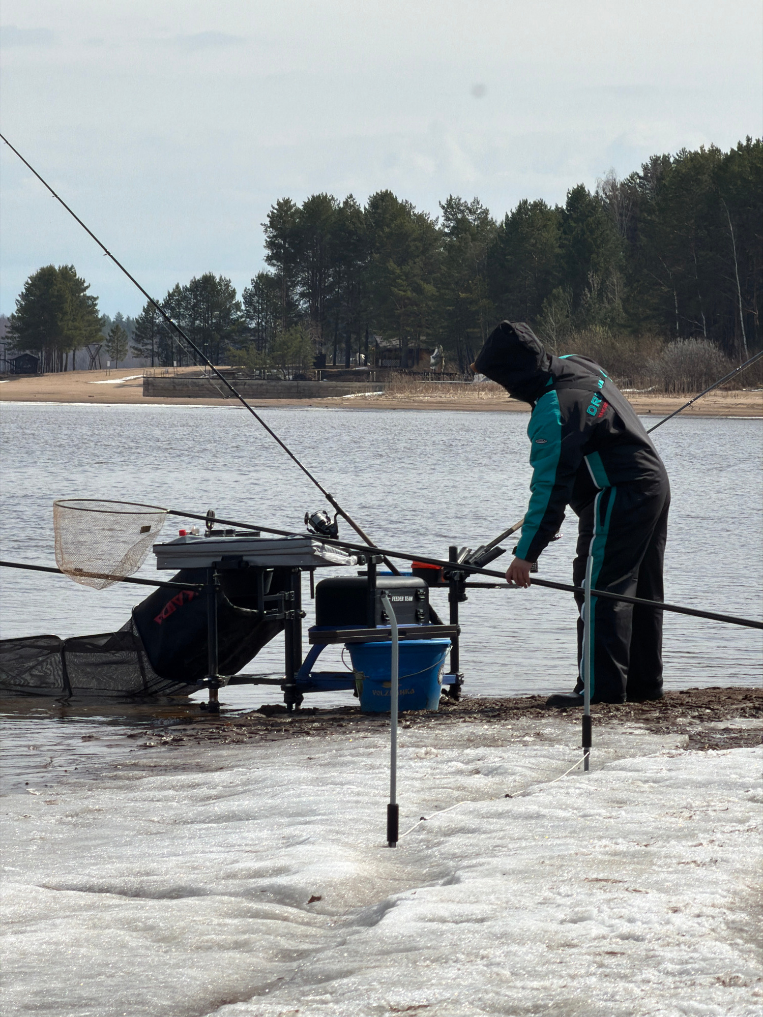 The image, oriented sideways, shows a person engaged in fishing by a body of water in Chaykovsky, Russia, under bright daylight. The individual is wearing a black and teal hooded jacket with the brand…read more