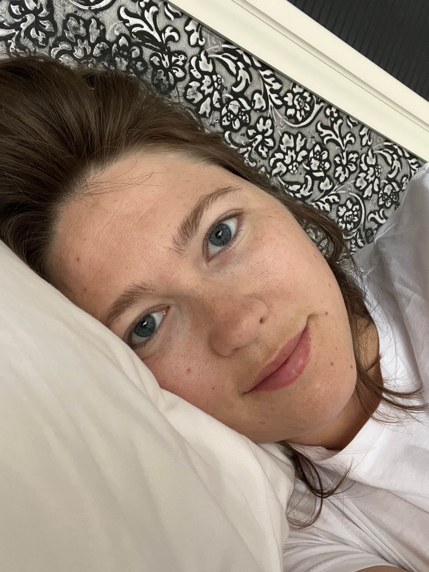 A close-up, slightly tilted portrait shows a fair-skinned person with blue eyes, light brown hair, and scattered freckles across their face, lying down in an indoor setting. The individual is looking…read more