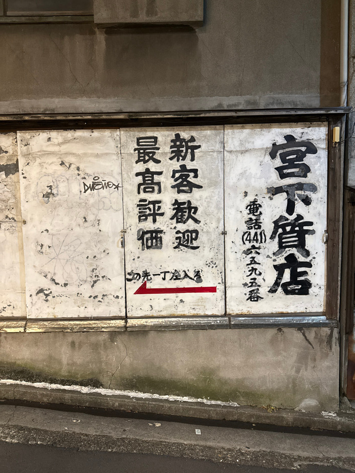 The image displays a weathered, multi-panel sign affixed to the lower section of a building facade in Shibuya, Japan, indicative of a location near a Miyashita Pawn Shop. The sign, composed of at leas…read more