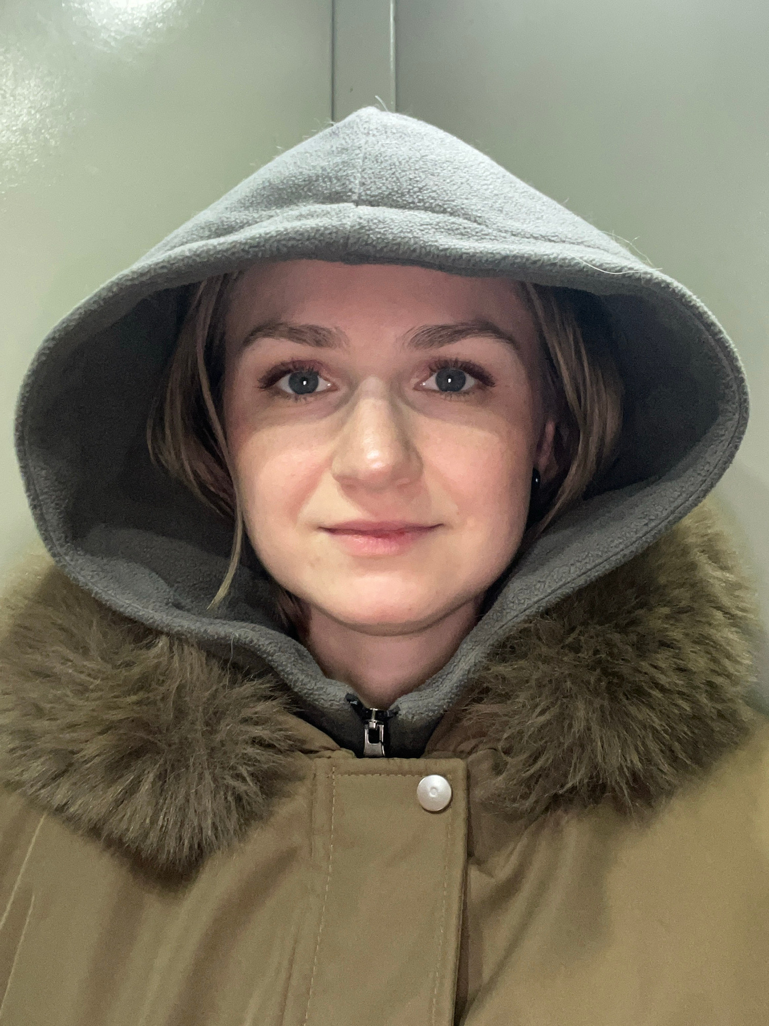 A close-up, vertically oriented portrait features an adult female looking directly at the camera with a calm expression and a subtle smile. She has light-colored eyes and her light brown hair is visib…read more