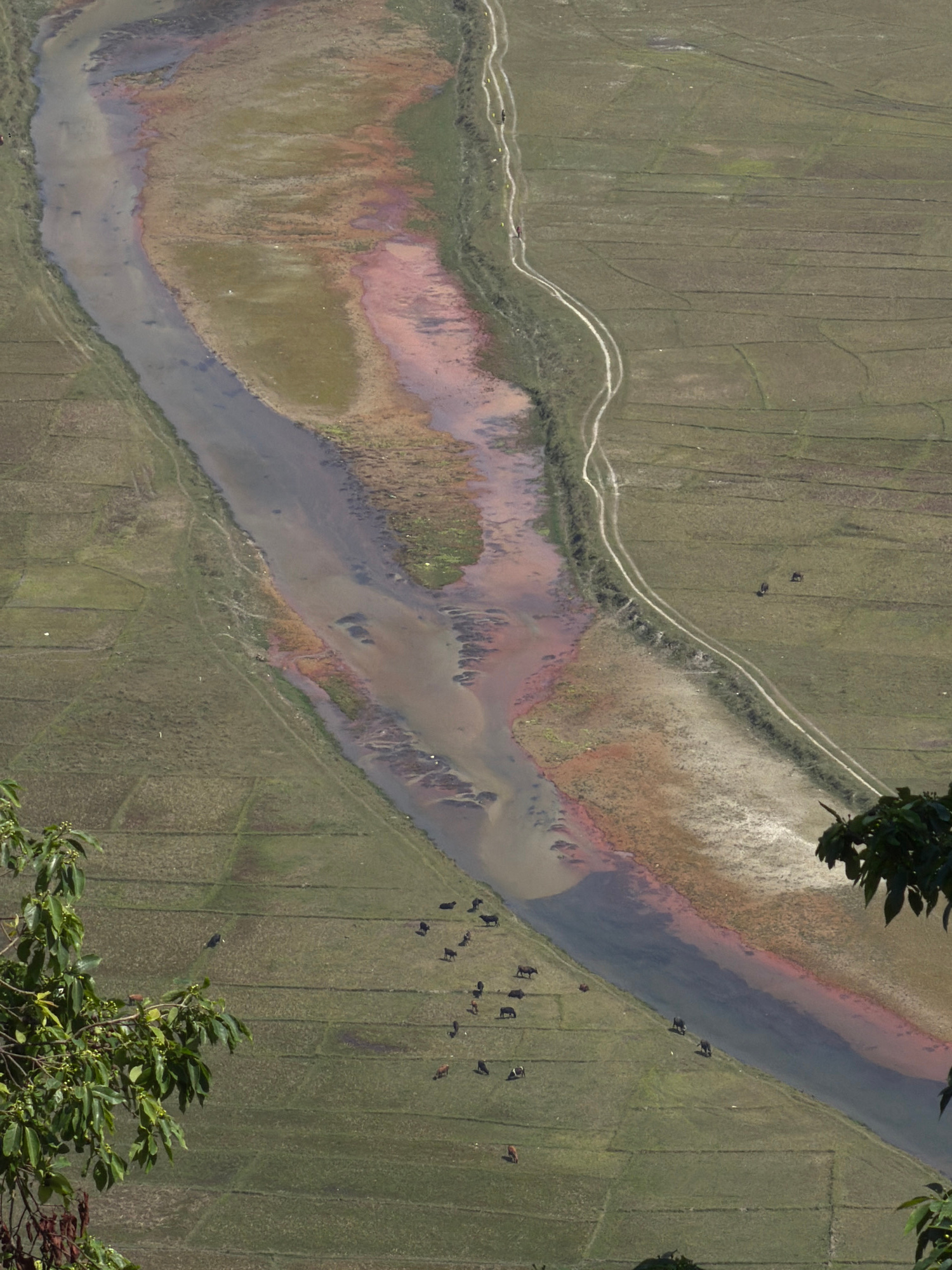 The image shows an aerial view of a river valley in the city of Pokhara, Nepal. The river flows through agricultural fields, and a herd of cattle is grazing on the right bank. A dirt road runs along t…read more