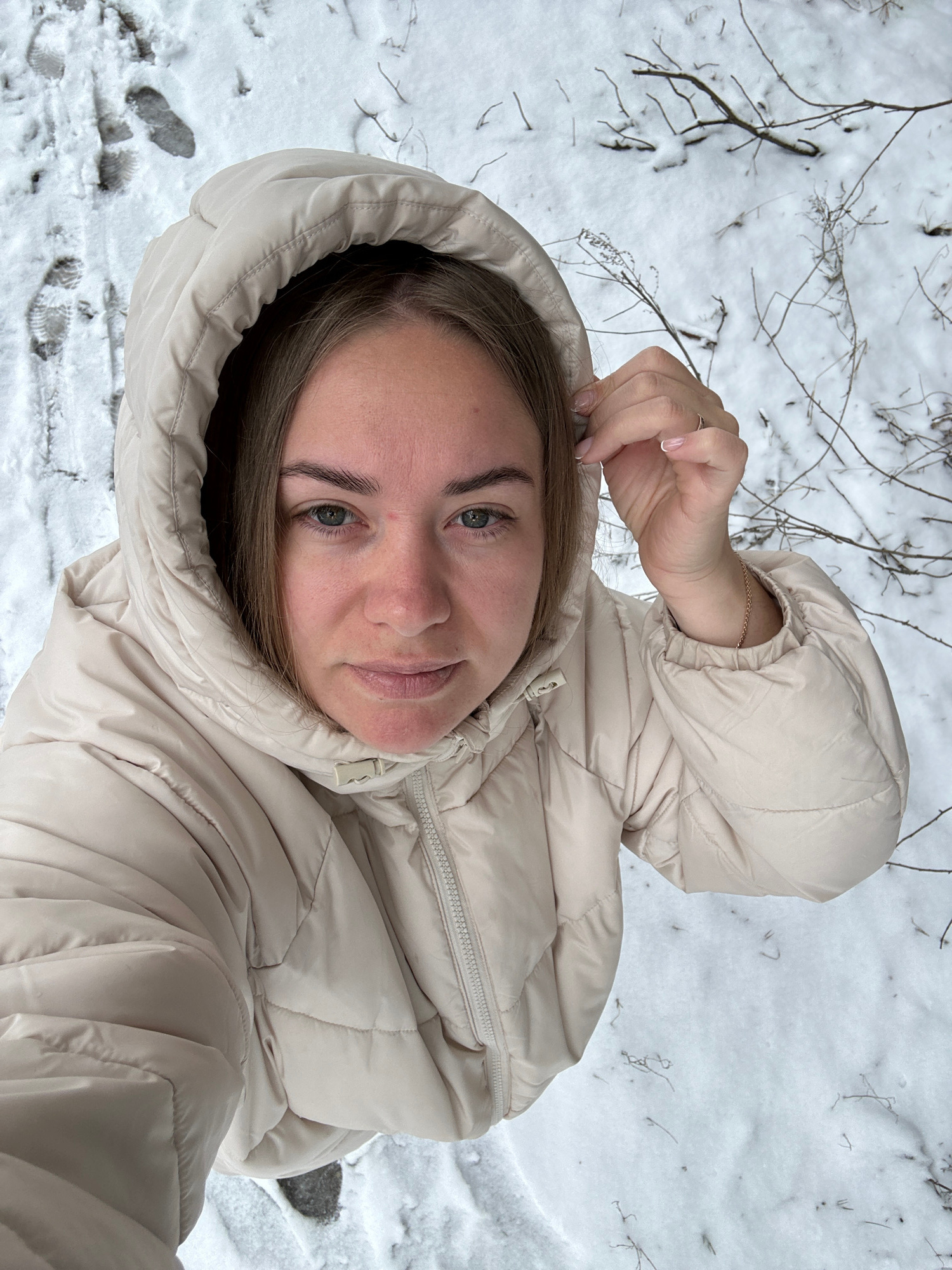 A woman wearing a beige puffer jacket with the hood up is looking down at the camera. She is standing in snow with visible footprints and some thin, bare branches. The location is Chaikovsky, Russia,…read more