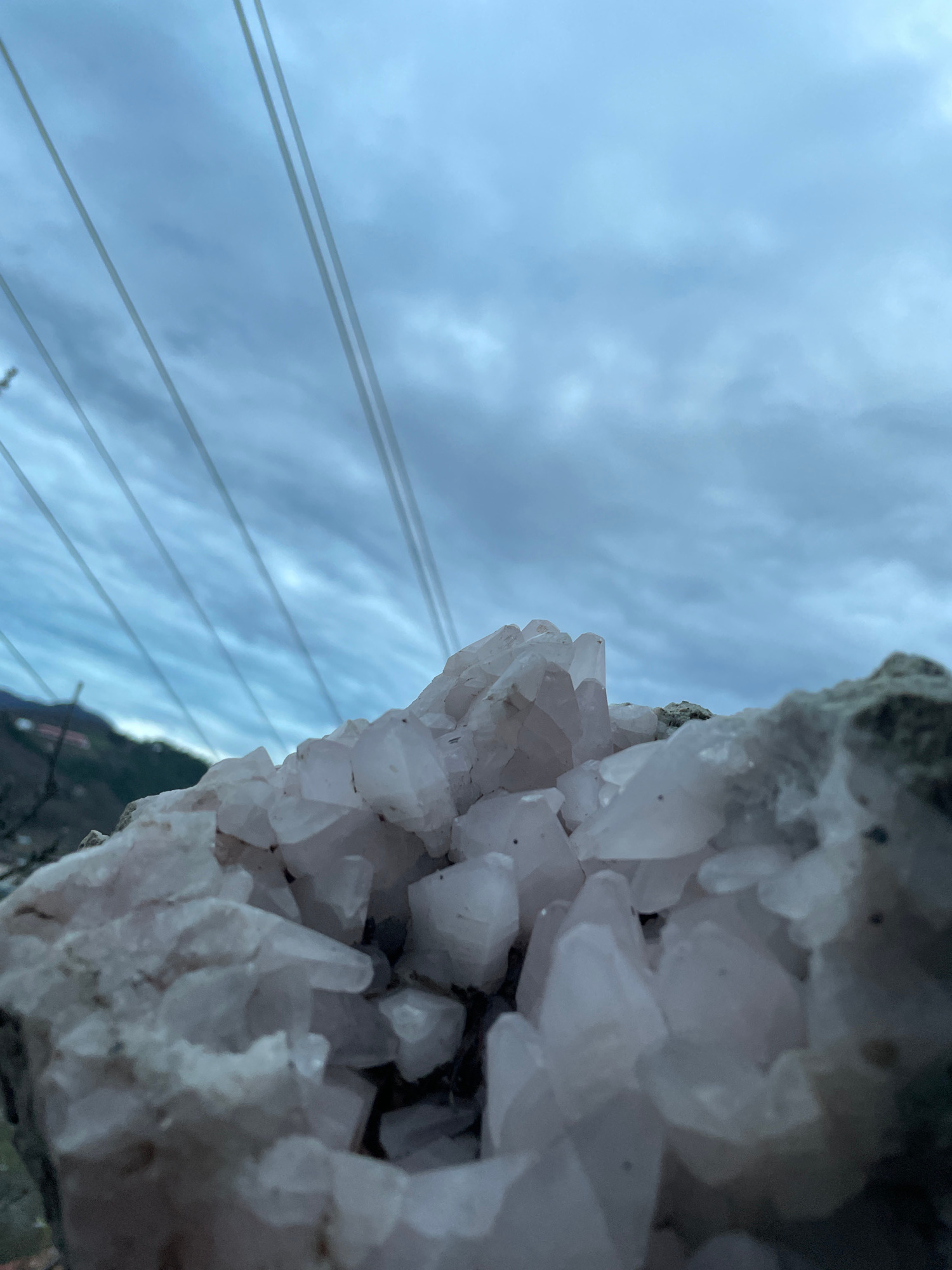 The image depicts a close-up of a quartz crystal formation against a cloudy sky. In the background, power lines are visible. The location appears to be Zlatograd, Bulgaria, indicated by the surroundin…read more