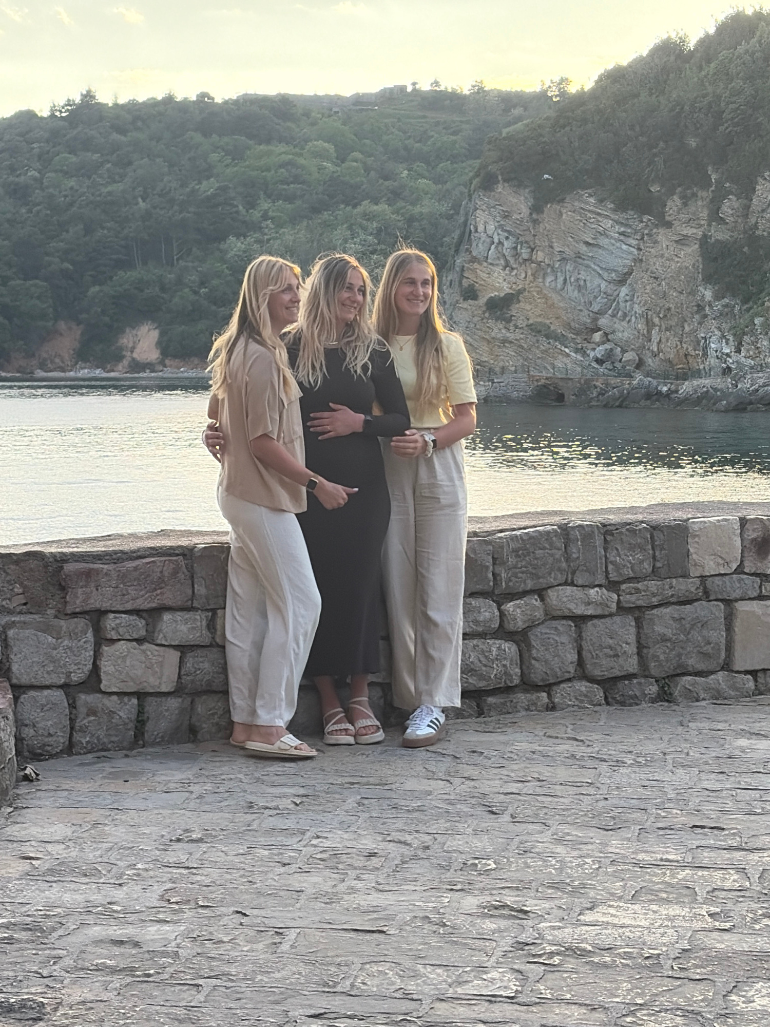 Three women are standing side by side, embracing, on a stone structure with a background of the Adriatic Sea and coastal mountains. The uppermost woman wears a yellow t-shirt and beige pants with whit…read more