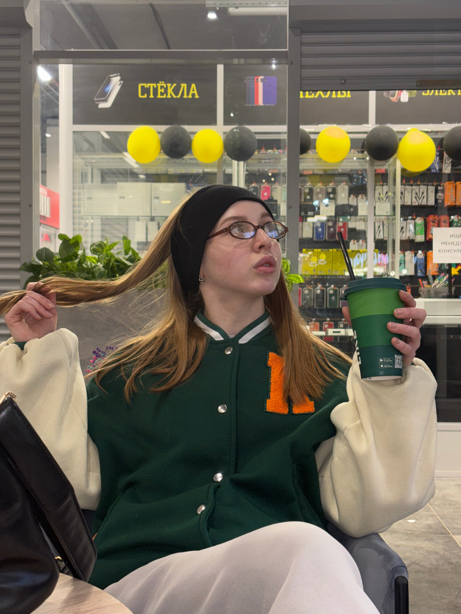 A woman with long brown hair, wearing a black beanie and glasses, is holding a green cup with a straw. She is wearing a green and white varsity jacket with an orange number on the chest. She is sittin…read more