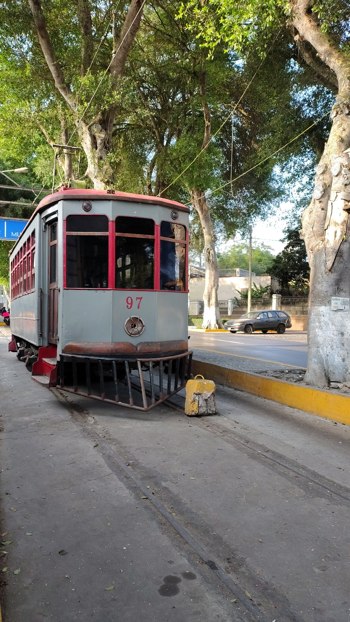 A vintage, grey and red tram car, numbered "97," sits on tracks adjacent to a sidewalk in Barranco, Peru. The tram is situated in a tree-lined area. Overhead wires are visible among the tree branches.…read more