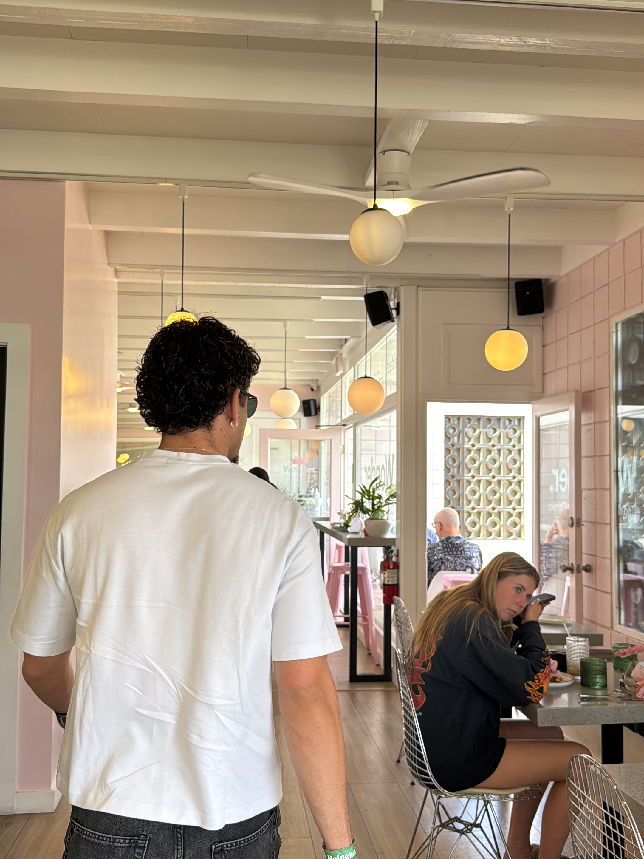 The photograph, taken indoors, shows a man with dark curly hair and sunglasses walking away from the camera. He is wearing a white t-shirt and dark jeans. In the background, a young woman with blonde…read more