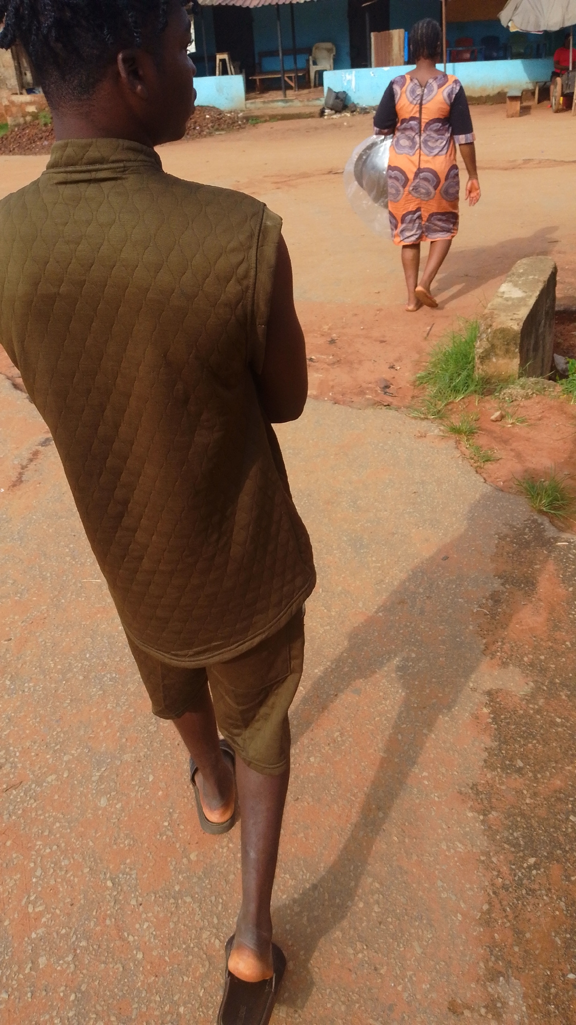 In Enugwu-Ukwu, Nigeria, the photograph shows two individuals walking away from the viewer. The closer person, seen from behind, wears a quilted olive-green sleeveless jacket and matching shorts withβ¦read more