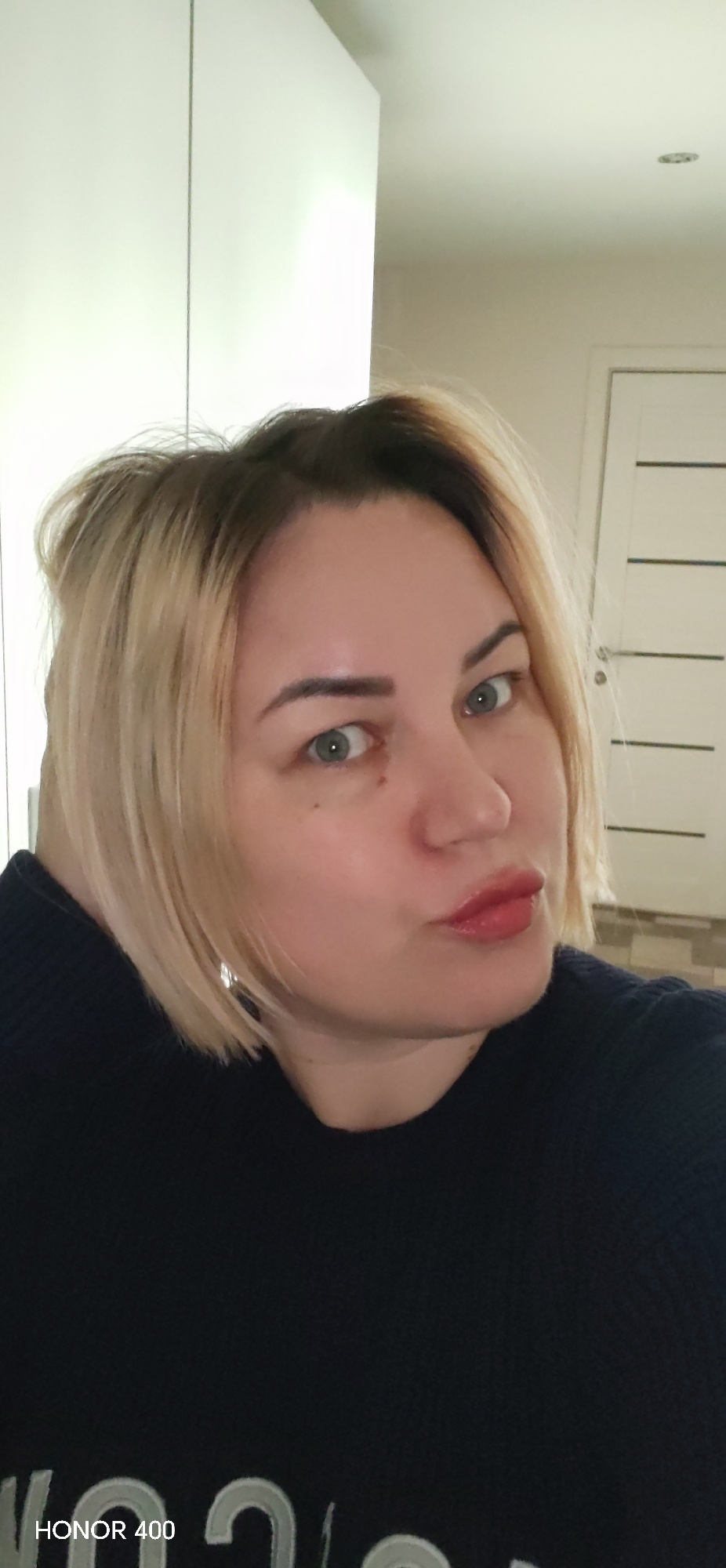 A selfie of a middle-aged woman with light blond hair, dark roots, and blue-green eyes is positioned indoors, possibly in a home environment. She is wearing a dark blue sweater and making a kissing face. Behind her, a white cabinet and a white door with horizontal panels can be seen. The camera watermark "HONOR 400" is visible in the lower left corner. There is no indication of Noviy, Russia. | Open Wire