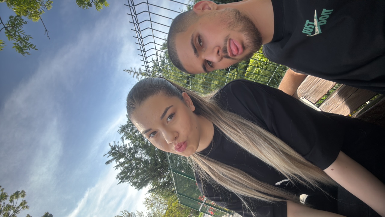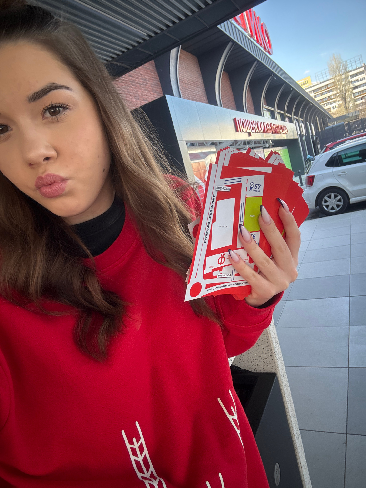 A woman is taking a selfie outside a building in Plovdiv, Bulgaria. She is wearing a red sweatshirt and holding a stack of red and white parking maps, one of which has a green square and the number 57…read more