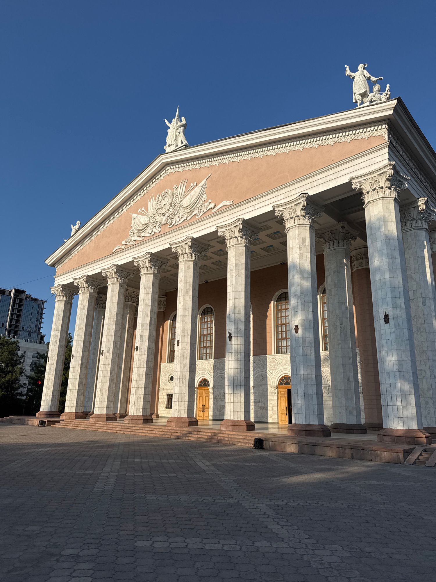 The image depicts the façade of a classical-style building with tall, fluted columns and ornate detailing located in Bishkek, Kyrgyzstan. The building has a pale pink exterior and is adorned with scul…read more