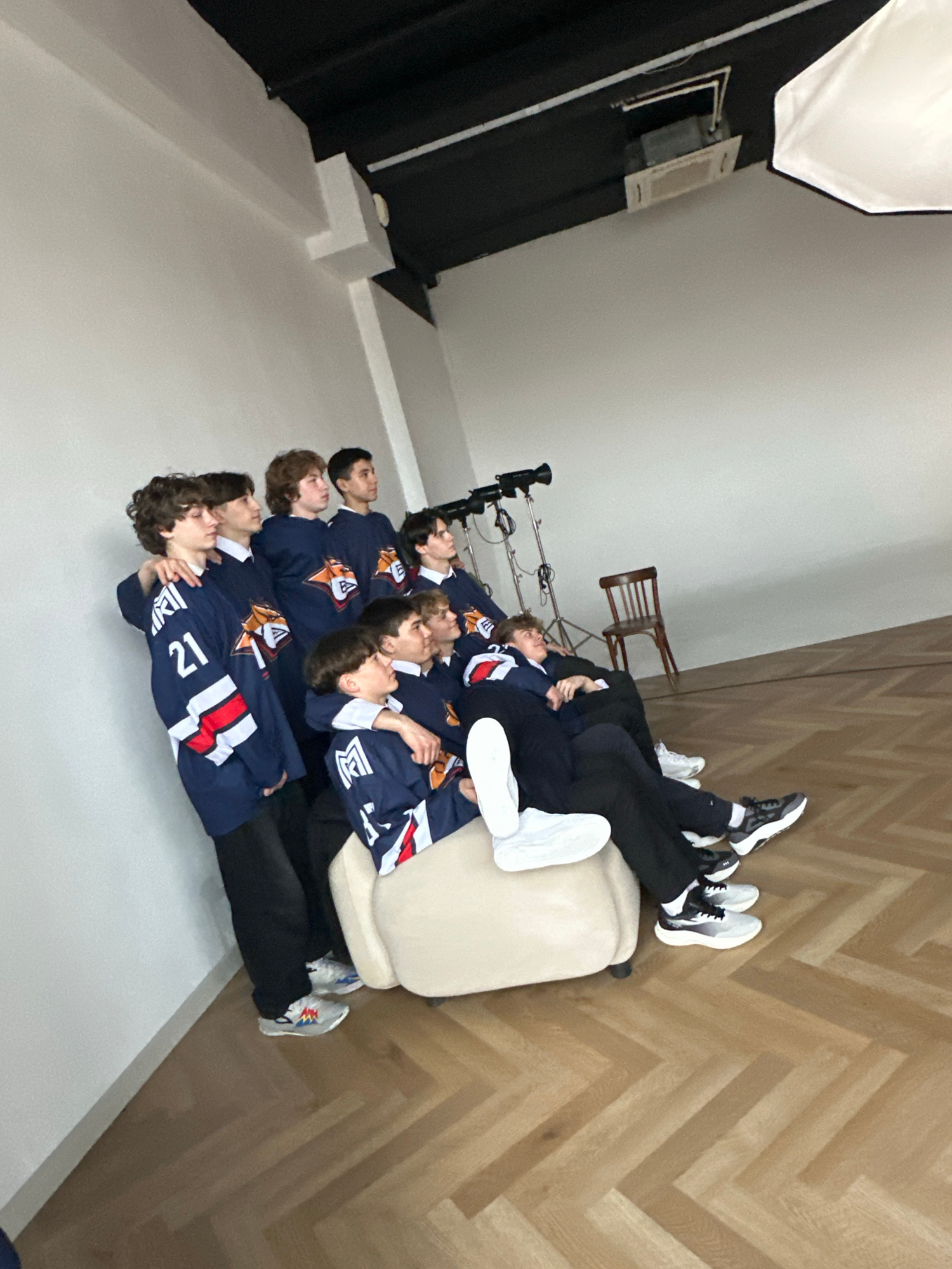 A group of six people, likely male, are arranged in a line, lying down on a light-colored couch in an interior setting. They are wearing what appear to be matching blue sports jerseys with white, red, and orange accents; the number "21" is visible on the front of the jersey closest to the viewer. The background features a herringbone pattern floor, a wooden chair, photography lighting equipment, and white walls. The location is in the city of Unknown, Unknown. | Open Wire