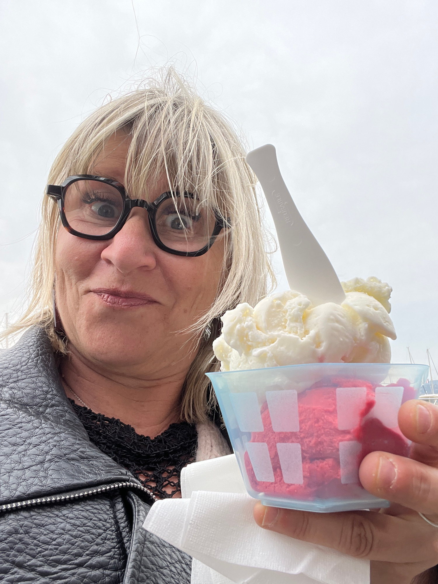 A woman holds up an ice cream in Cavalaire-sur-Mer, France. She is wearing black glasses, a black leather jacket, and a black lace top. The ice cream has a white scoop and a red scoop. The red scoop i…read more