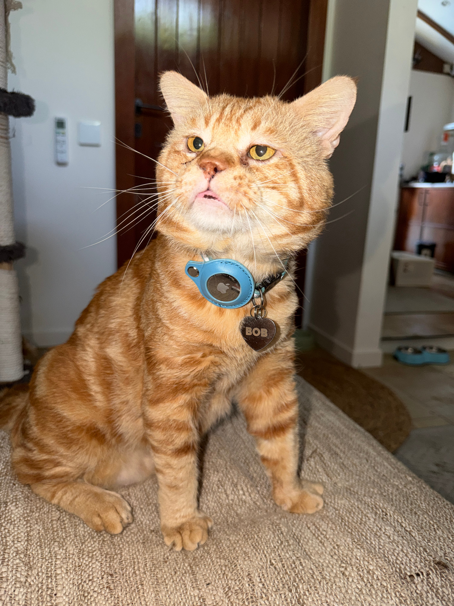 A medium shot depicts an orange tabby cat, named "Bob" based on its collar tag, resting on a neutral-toned textured surface. The cat is wearing a light blue collar with a tracking device attached. Theβ¦read more