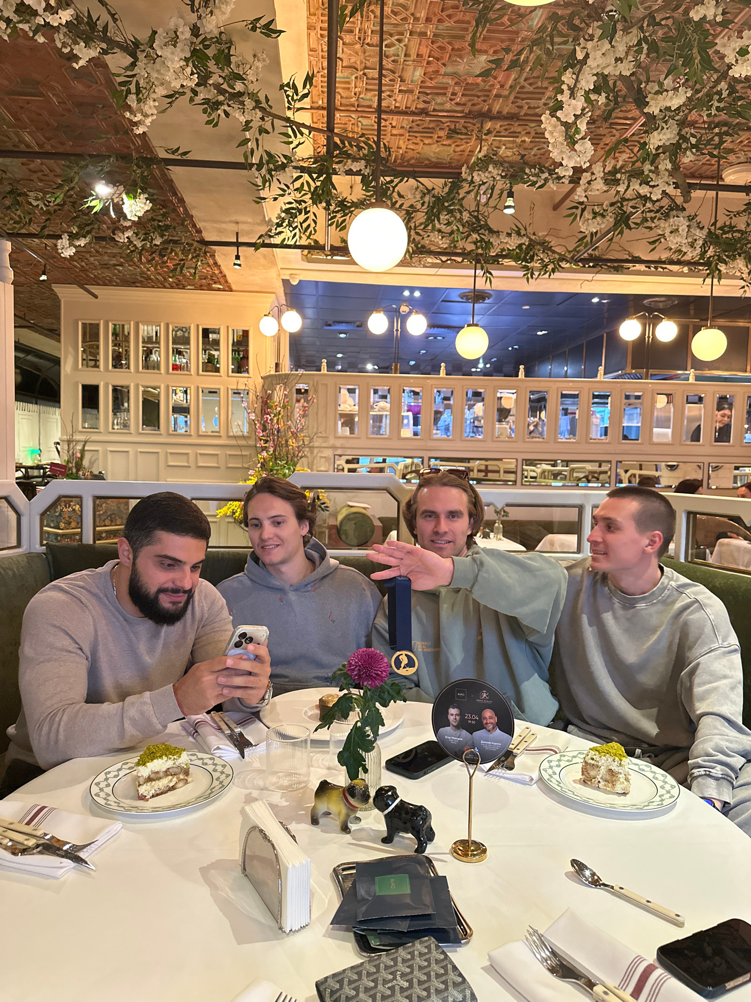 Four young men are seated at a round table in a restaurant in Moscow, Russia. They are likely at a celebratory event. On the table are plates with slices of pistachio cake, napkins, silverware, a phon…read more
