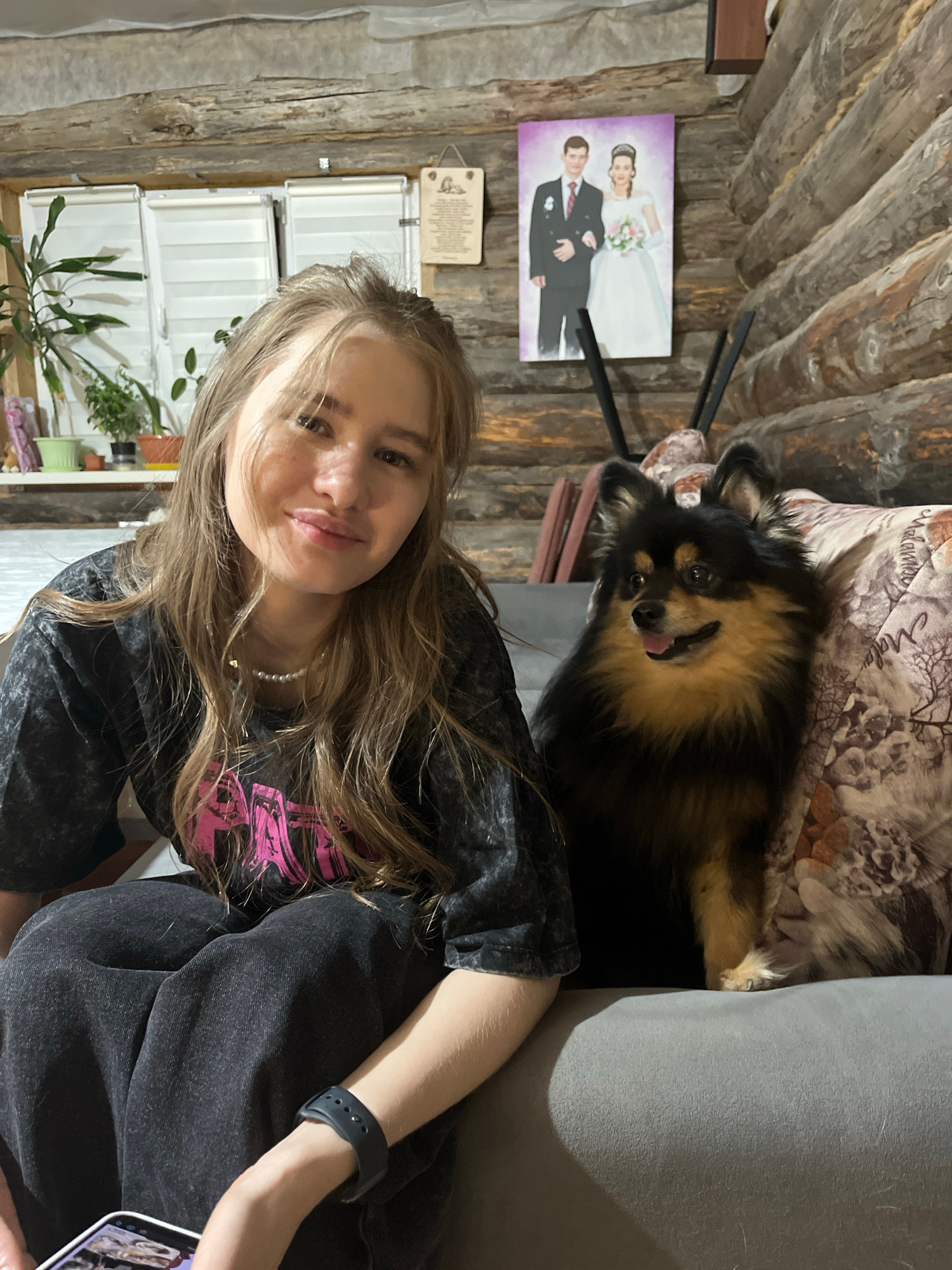 A young woman with long blonde hair, wearing a dark t-shirt and a watch, is sitting on a gray couch. A black and tan dog is lying on the couch next to her. The background features a log cabin-style wa…read more